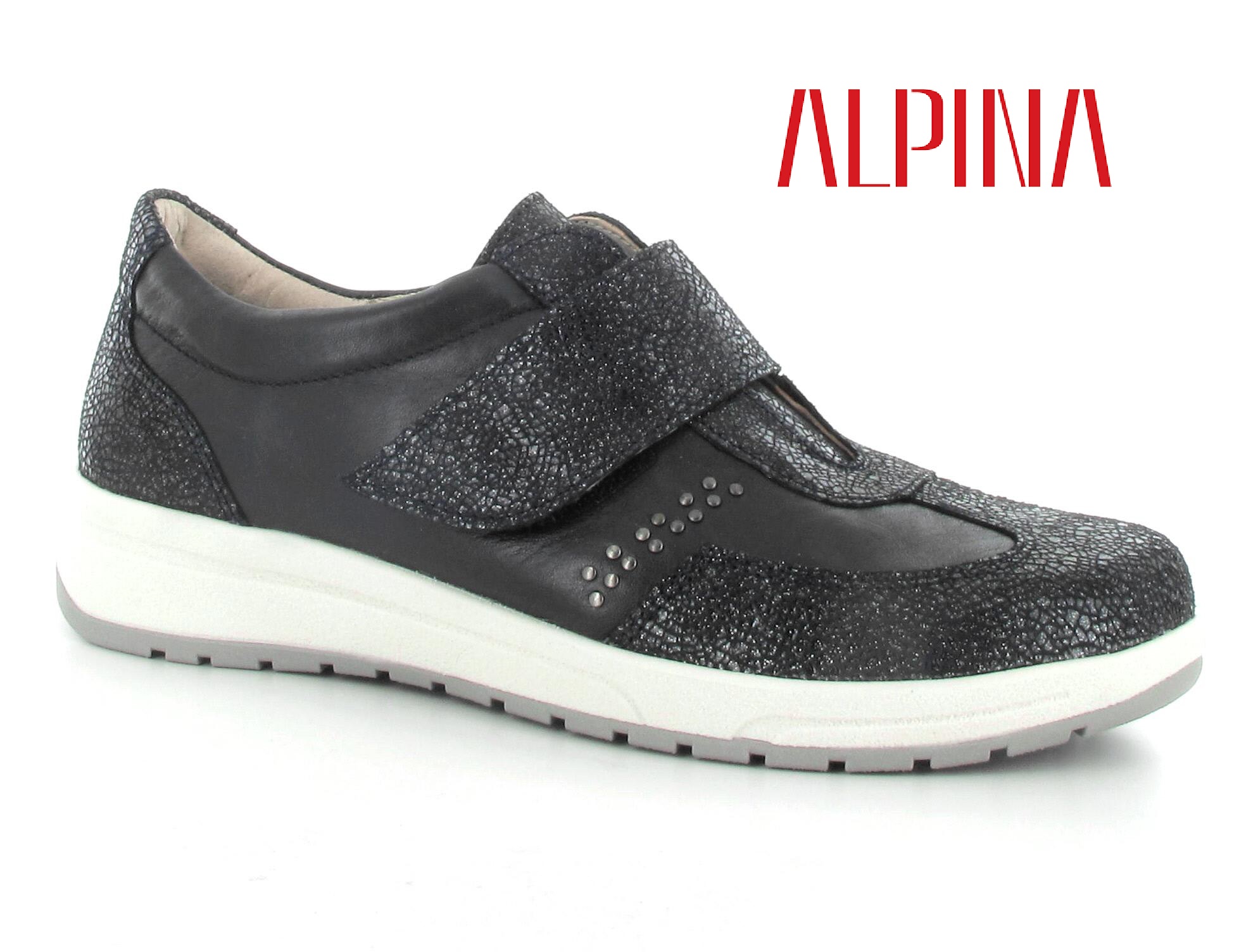 Alpina normaalilla G-lestillä varustettu nahkainen kävelykenkä, jonka nupukkinahkaiset osat on somistettu himmeän metallinhohtoisilla kuvioilla .Päällä ja sivuilla kestävää pintanahkaa. Ulkosivulal metalliniittejä somisteena. Edessä kätevä tarrakiinnitteinen remmi helpottamassa pukemista. Vuori on pehmeää ja hengittävää tekstiiliä. Kengissä on irroitettava, pehmeä hyvällä ilman kierrolla varusteetu pohjallinen. Alpitex-pinnoite hylkii kosteutta. Pohja on muotoiltu, joustava, taipuisa ja luistamaton.