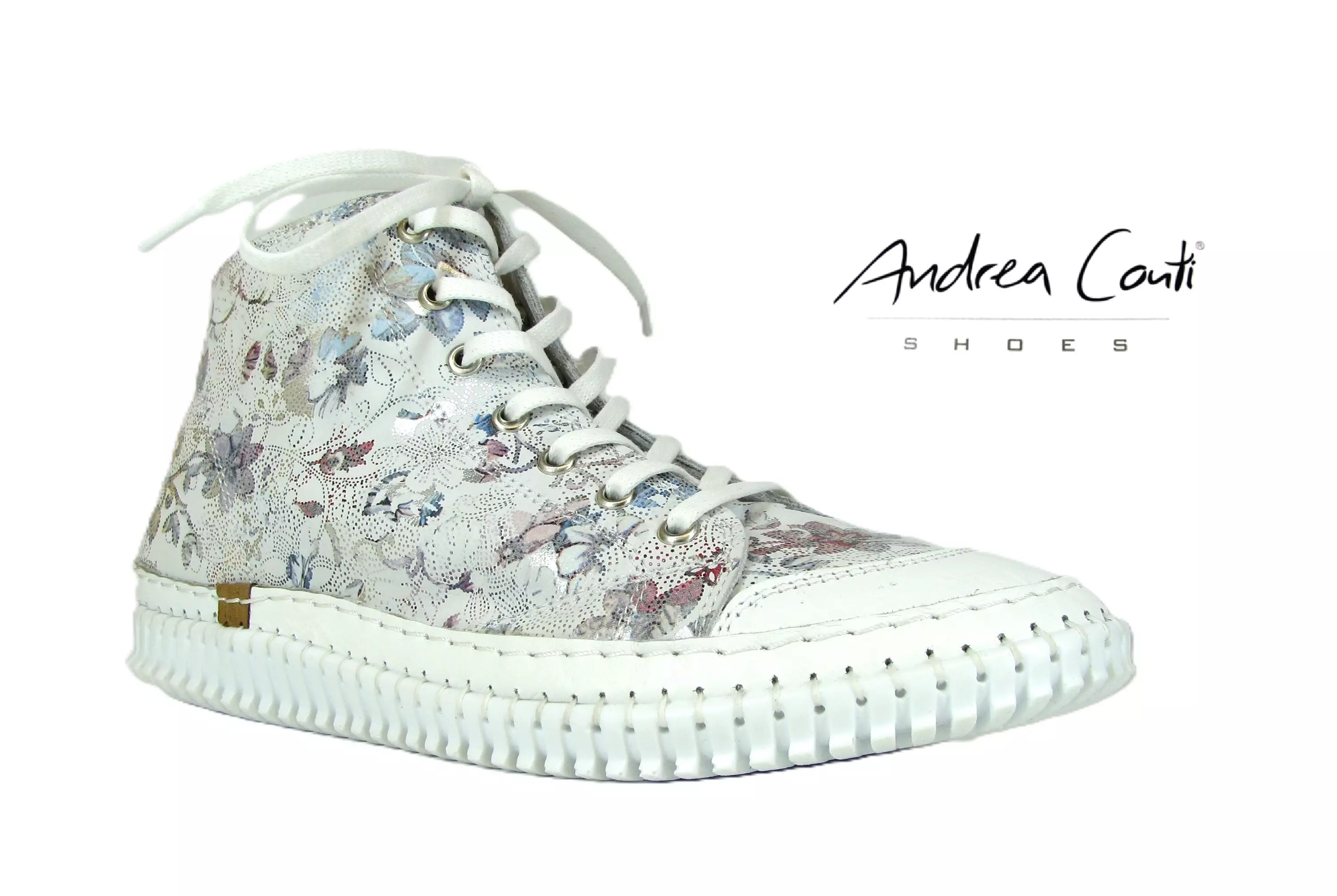 Andrea Contin varsitennarit, joiden päälli- ja sisäosat on valmistettu aidosta ja laadukkaasta pehmeästä nahasta. Edessö sirot nauhat ja sisäsyrjällä pukemista helpottava vetoketju. Tennareissa on irroitettava ja pehmustettu nahkapintainen pohjallinen. Todella joustavan ja tasaisen ulkopohjan korkeus kannassa on n. 2 cm. Normaali lesti.