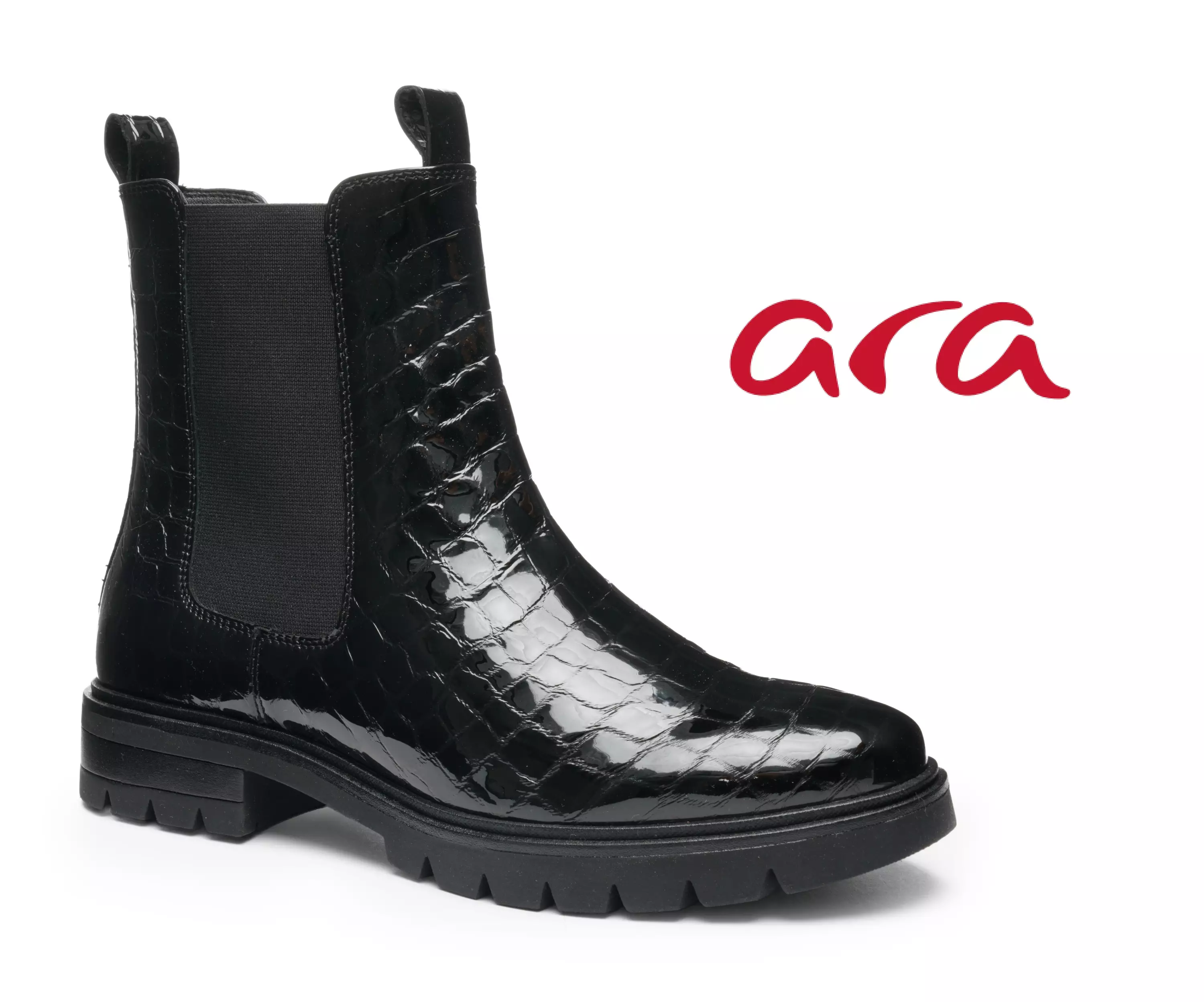 Aran tyylikkäät nilkkurit, joiden päällinen on valmistettu aidosta ja laadukkaasta nahasta. Päällistä koristaa upea krokotiilinnahkaa muistuttava lakeeripaloista muodostuva pinta. Ulkosyrjällä leveä venykepala tuomassa varteen parhaan mahdollisen istuvuuden. Sisäsyrjällä vetoketju helpottamassa kengän pukemista. Sisäosissa on ihanan pehmeä ja kevyt tekstiilivuori. Tässä kengässä on irrotettava, todella hyvin pehmustettu sekä muotoiltu tekstiilipintainen Aran High Soft -pohjallinen. TPR-kumisekoitteesta valmistettu pohja on hyvin kuvioitu, ja ehkäisee tehokkaasti luistamista erilaisilla pinnoilla. Pohjan korkeus kannassa n. 3cm. Tässä kengässä on normaali G-lesti.