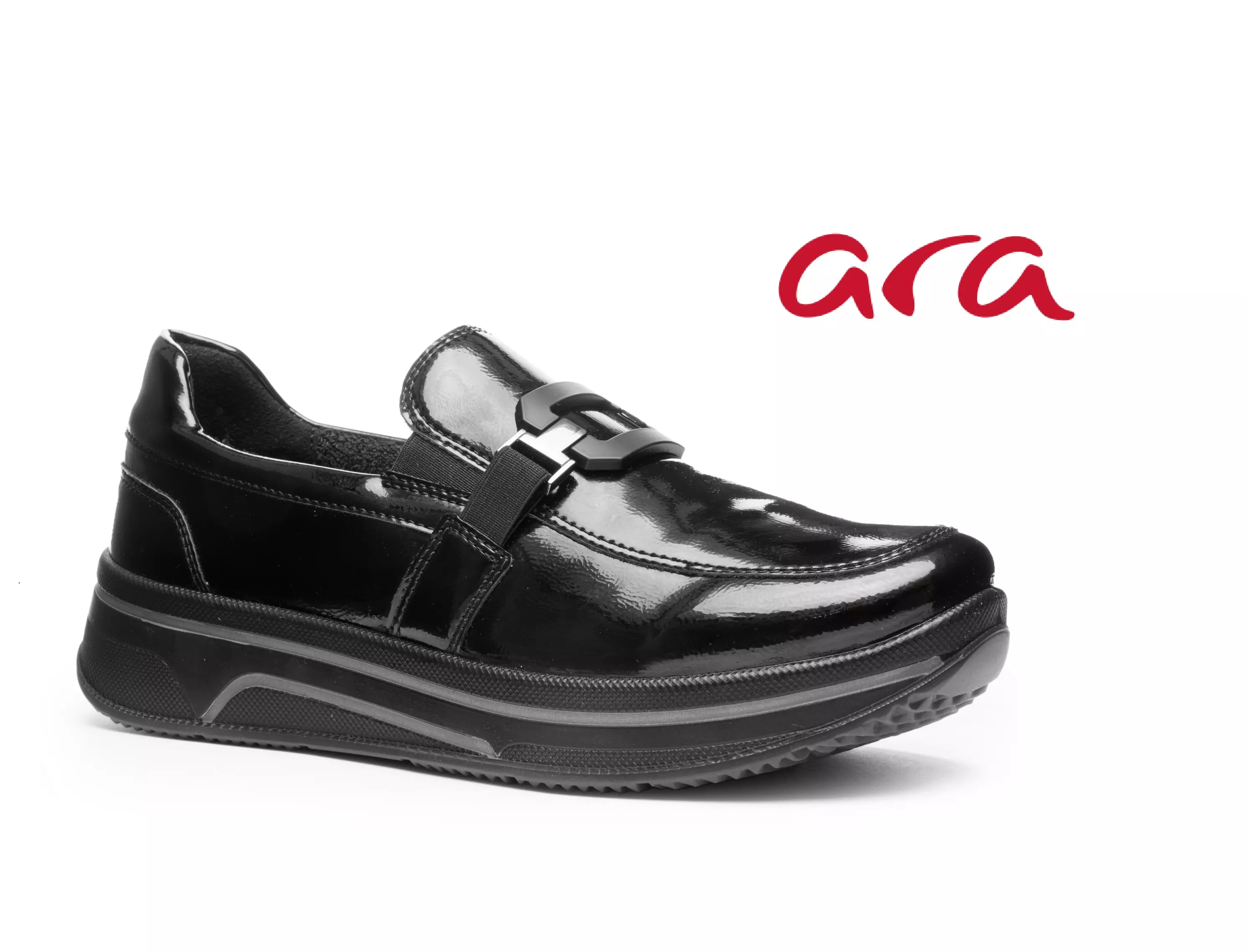 Aran korkealuokkaisesta nahasta valmistetut lakeeripintaiset loaferit. Edessä kaunis mattamustaa ja titaanin väriä yhdistelevä suorakaiteen muotoinen solki. Kengän vuoriosat ovat pohjallisen päällistä myöten äärimmäisen pehmeää tekstiiliä. Kengissä on irrotettava, todella hyvin pehmustettu, muotoiltu ja jalan painon alla muotoutuva High Soft -pohjallinen. Erityistä huomiota pehmeyteen on kiinnitetty pohjallisen kannassa, holvikaaressa sekä jalan keskiosassa. Tukevan pohjan korkeus kannassa on n. 4 cm. Tässä kengässä on normaalia lestiä tilavampi H-lesti
