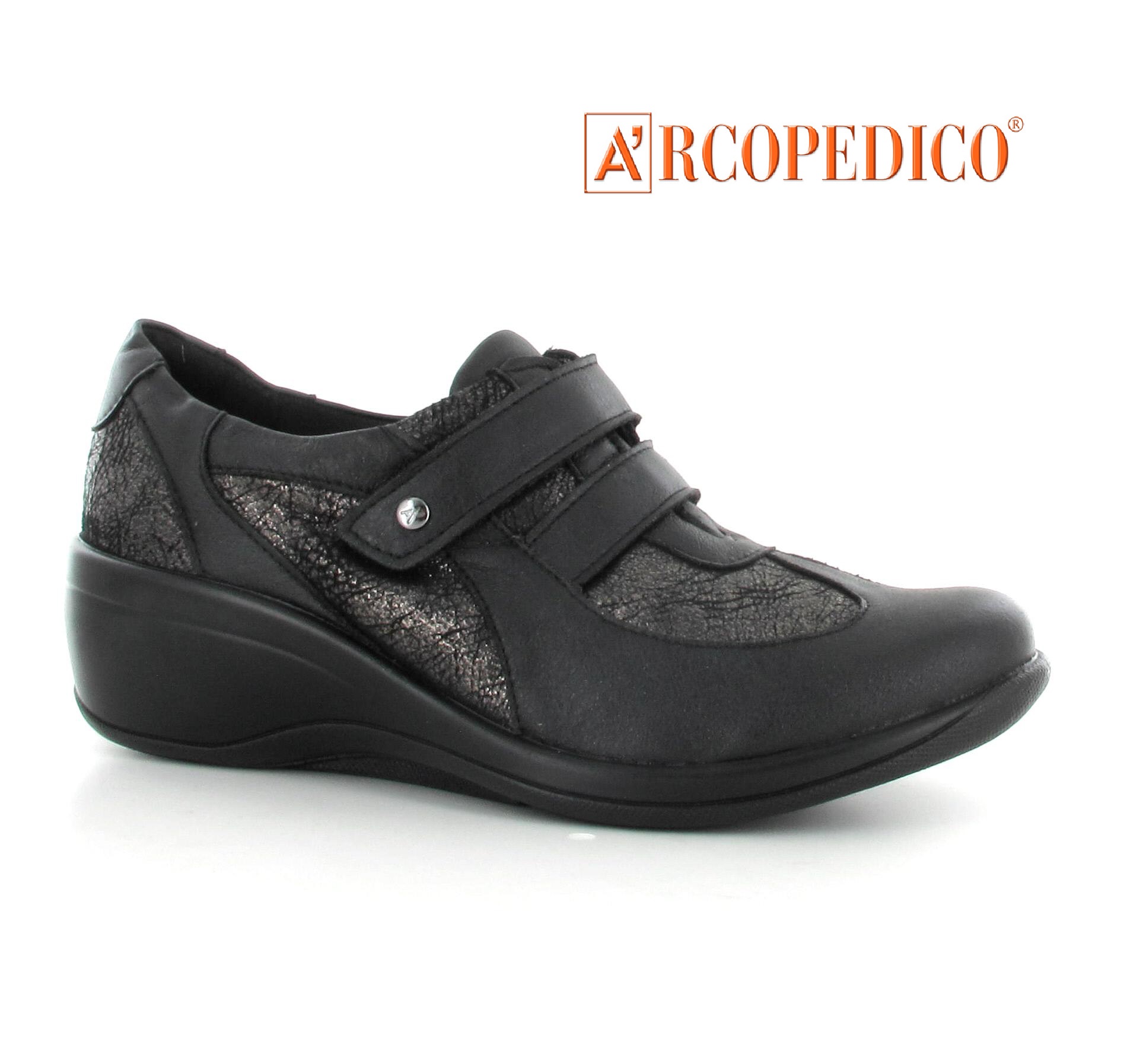 Arcopedicon L101 kiilapohjaiset kävelykengät. Päällinen kauniisti pronssinvärisellä somisteella koristeltua Lytech-materiaalia. Päällä tarraremmit helpottamassa pukemista sekä mahdollistamassa parhaan mahdollisen istuvuuden myös reilummin tilaa tarvitsevalle jalalle. Irrotettava pohjallinen on hyvin pehmustettu sekä kevyesti muotoiltu. Kengissä on todella hyvä holvikaaren tuki. Joustavan ja taipuisan pohjan korkeus kannassa n. 5 cm.