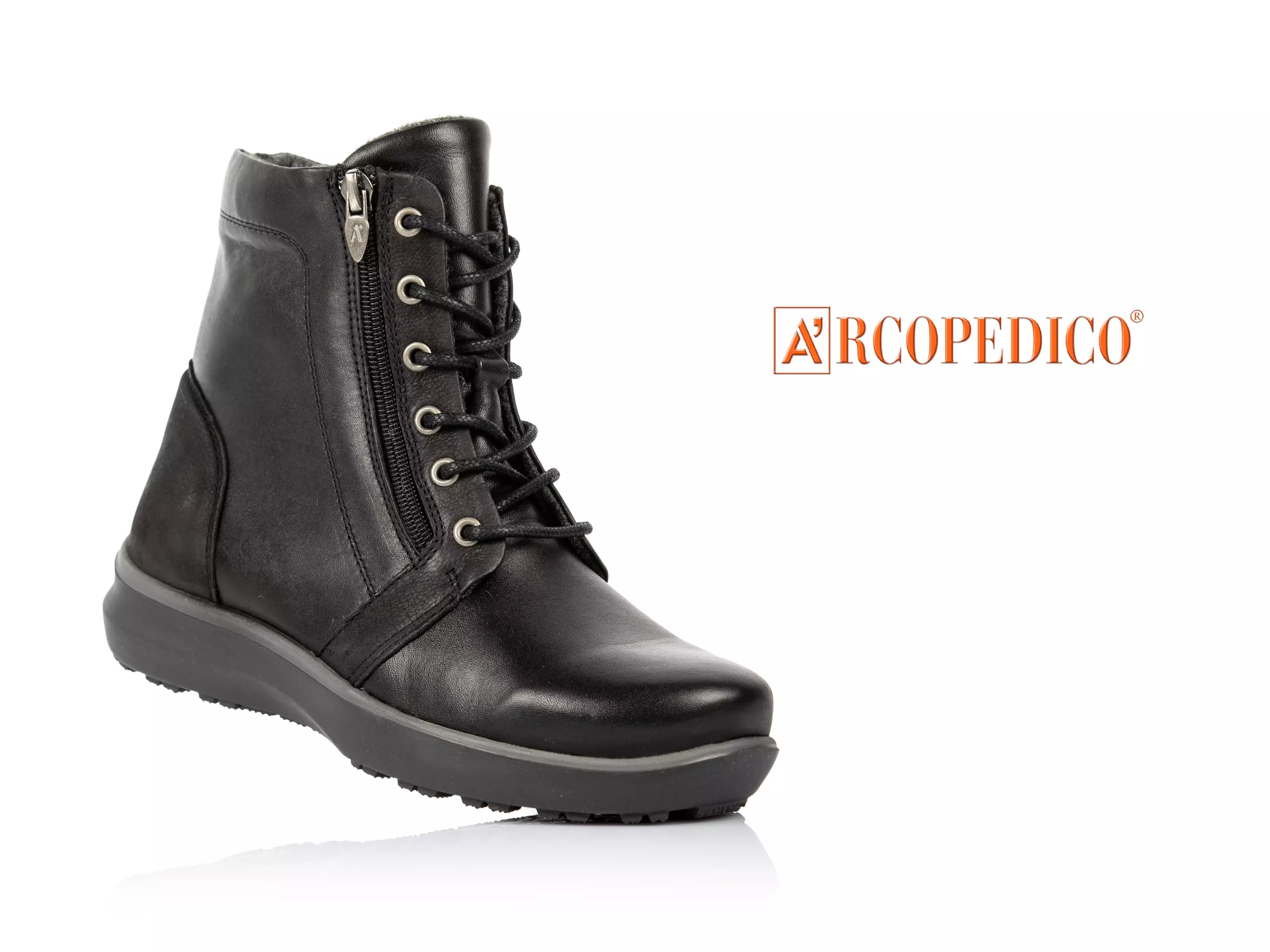 Arcopedicon tilavat nilkkurit, joiden pinta on valmistettu aidosta ja laadukkaasta nahasta. Etuosan molemmin puolin olevat vetoketjut mahdollistavat kengän suuaukon laajan aukeamisen ja helpottavat kengän pukemista. Nauhojen avulla kengän tilavuutta saa säädettyä monipuolisesti. Sisäosan vuoressa on aitoa hengittävää ja pehmeää villaa. Irrotettava pohjallinen on hyvin pehmustettu. Tukevassa mutta joustavassa ulkopohjassa on käytetty luistamista ehkäiseviä materiaaleja sekä hyvää kuviointia, ja siinä on valmiina paikat irtonastoille. Tilava lesti. Valmistettu Portugalissa.