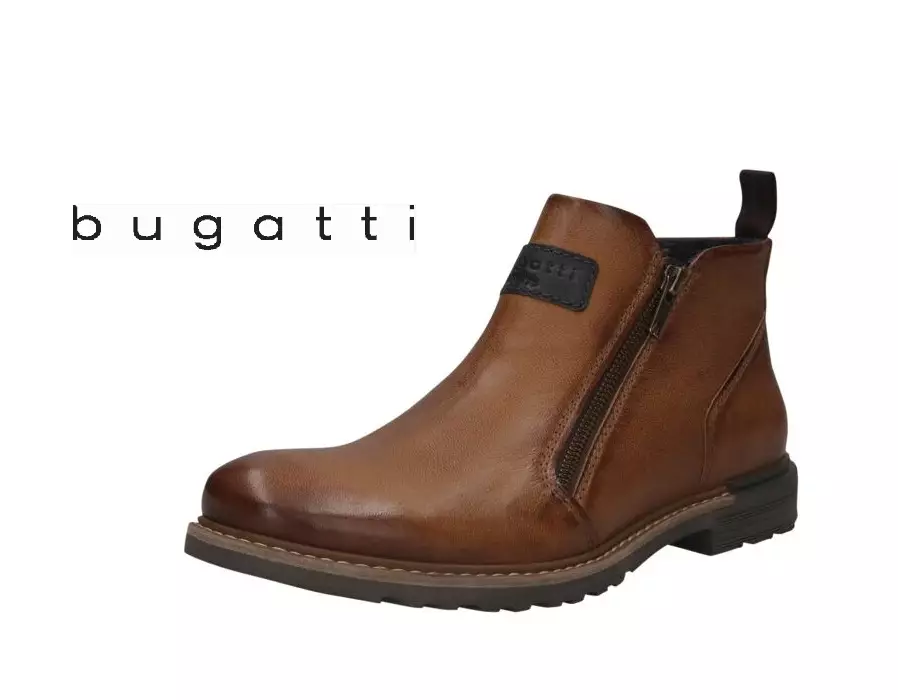 Bugatin ajattomat nilkkurit, joiden päälliosat on valmistettu aidosta ja laadukkaasta nahasta. Etuosan molemmilla sivuilla vetoketjut helpottamassa kengän pukemista. Vuoriosat ovat nahkaa ja kevyttä tekstiiliä. Kengissä on pehmustettu nahka- ja tekstiilipintainen pohjallinen. Joustavan ja hyvin kuvioidun kumisekoitteesta valmistetun pohjan korkeus kannassa on n. 2,5 cm. Normaali lesti.