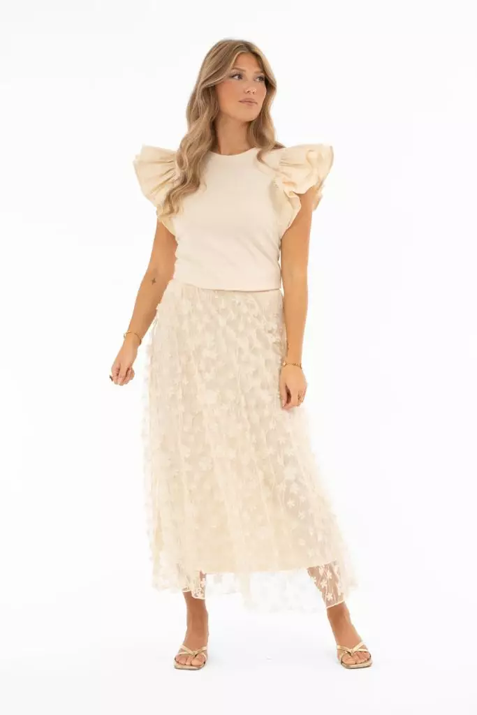 Capri Collectionin näyttävä pitkä hame, jonka läpikuultavassa päällikankaassa kauniita eri kokoisia kohokukkia. Päällikankaan alla pehmeä alushame. Joustava vyötärö. Löydät tämän hameen kaltaisen paidan tuotenumerolla 26023.