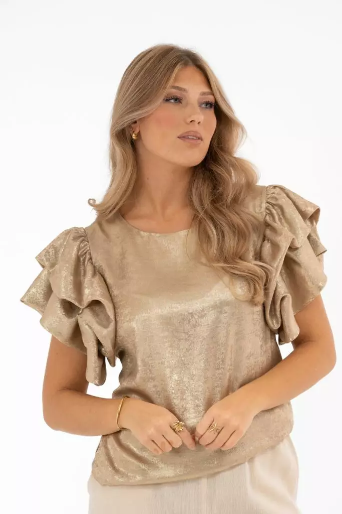 Capri Collectionin kauniisti kimalteleva Sephyra paita, jossa upeat ja näyttävät t-paitamittaiset hihat ja pyöreä pääntie. Helman molemmilla sivuilla lyhyet halkiot.