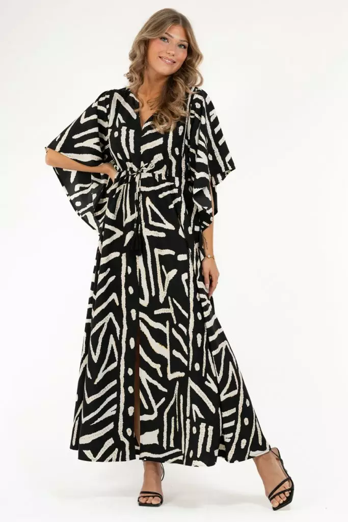 Capri Collectionin Elysee mekko, jossa näyttävä kuosi sekä ilmavat puolipitkät hihat. Vyötäröllä sekä niskassa ohuet narut, joiden avulla mekkoon saa haluamaansa mallia. V-mallinen pääntie. Helman alaosan keskellä halkio.