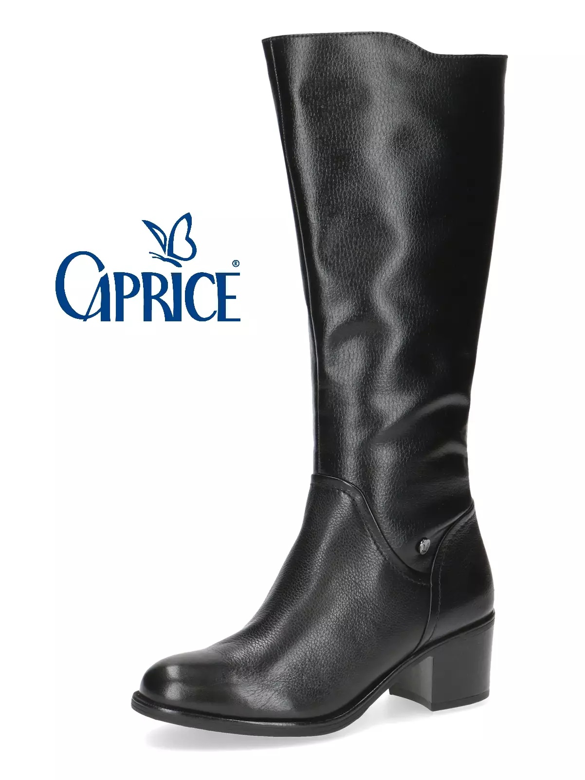 Capricen korkosaapas, jonka pääliosat on pääosin valmistettu aidosta ja laadukkaasta nahasta. Sisäsyrjän vetoketju helpottaa saapaan pukemista. Takaosassa avattava vetoketju, jonka avaamalla varteen saa tarvittaessa hyvin lisätilaa. Sisäosissa on pehmustettua pohjallista myöten ihanan pehmeä tekstiilivuori. Koron korkeus n. 5,5 cm. Normaali lesti.