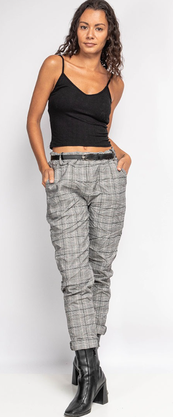 C'Belle ruutuhousut on valmistettu Italiassa. Materiaali on joustavaa viskoosi (60%) , polyester (35%) ja elastaani (5%) yhdistelmää.