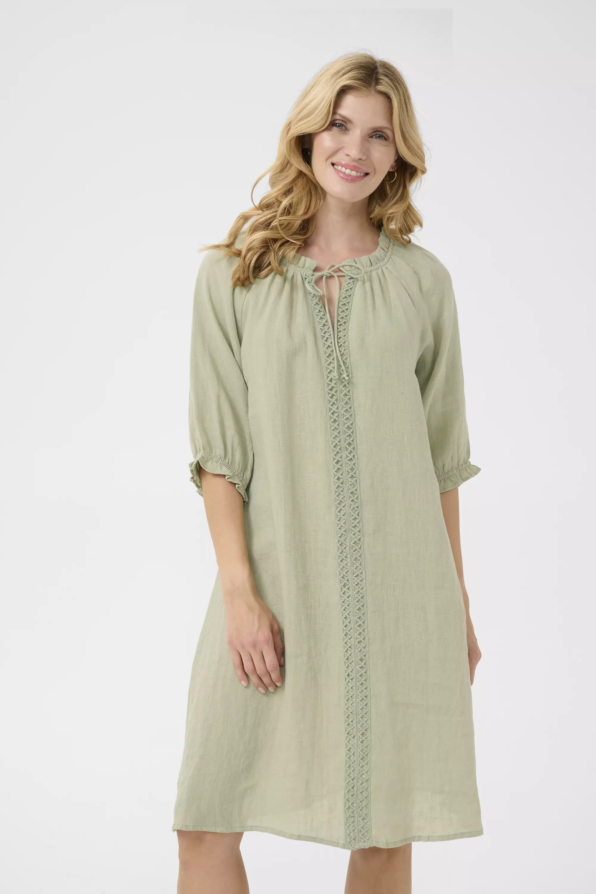 Creamin ihana CRBellis pellavamekko. Sivuilta pyöreässä pääntiessä keskellä v-mallinen muotoilu, sekä siro somittava nauha. Keskellä kaunis pääntiestä helmaan asti ulottuva yksityiskohta sekä huolitellut puolipitkät hihat.