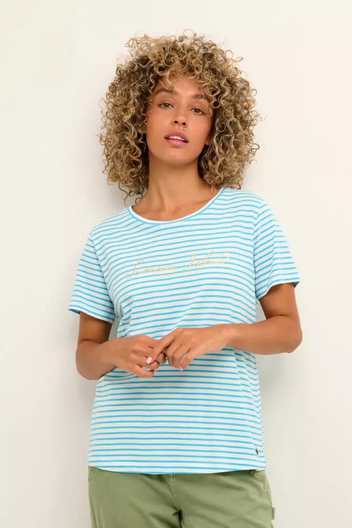 Creamin CRSaste t-paita raikkaassa raitakuosissa. Edessä kaunis kullanvärinen tekstiyksityiskohta.
