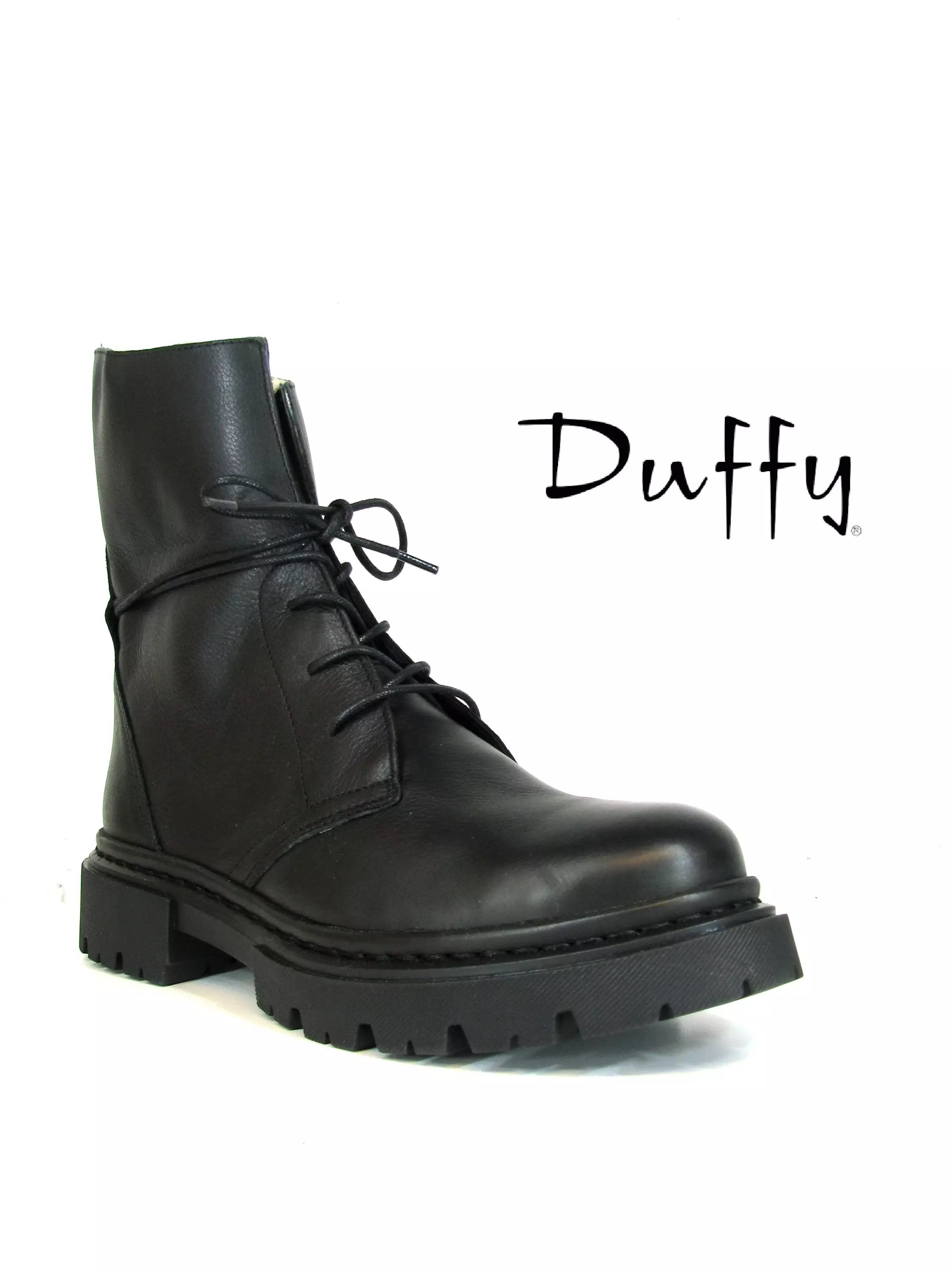 Duffyn tukevapohjaiset nilkkurit, joiden päälliosat on valmistettu laadukkaasta ja aidosta nahasta. Edessä nauhakiinnitys, joka kiertää nilkan ympäri mahdollistaen näin kengän napakan istuvuuden. Sisäosissa paksuhko tekstiilivuori. Myös pohjallisen pinta on pehmeää, hieman lyhtkarvaisempaa tekstiiliä. Ulkopohja on hyvin kuvioitu, pitävä sekä todella tukeva. Pohjan korkeus kannassa on n. 3-3,5cm.