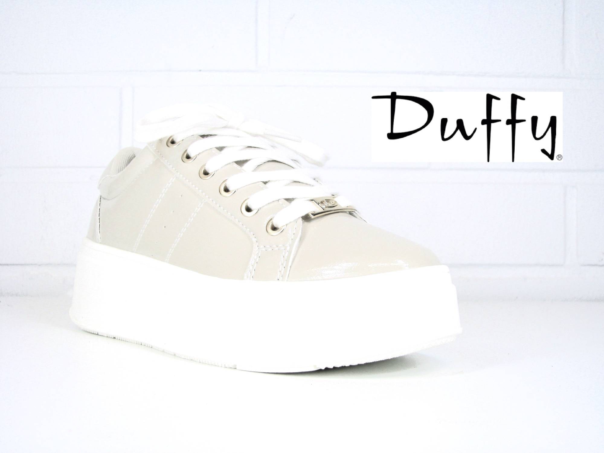 Duffyn paksupohjainen tennari, jonka päälliosat on valmistettu helposti puhdistettavasta lakeeripäällysteisestä nahkajäljitelmästä. Edessä nauhakiinnitys, jonka avulla kenkä on helppo säätää juuri jalkaan sopivaksi. Sisäosat ovat pehmustetun pohjallisen pintaa myöten miellyttävää tekstiiliä. Paksuhkon ulkopohjan korkeus kannassa n. 5cm. Kumisekoitepohja ehkäisee luistamista erilaisilla pinnoilla.