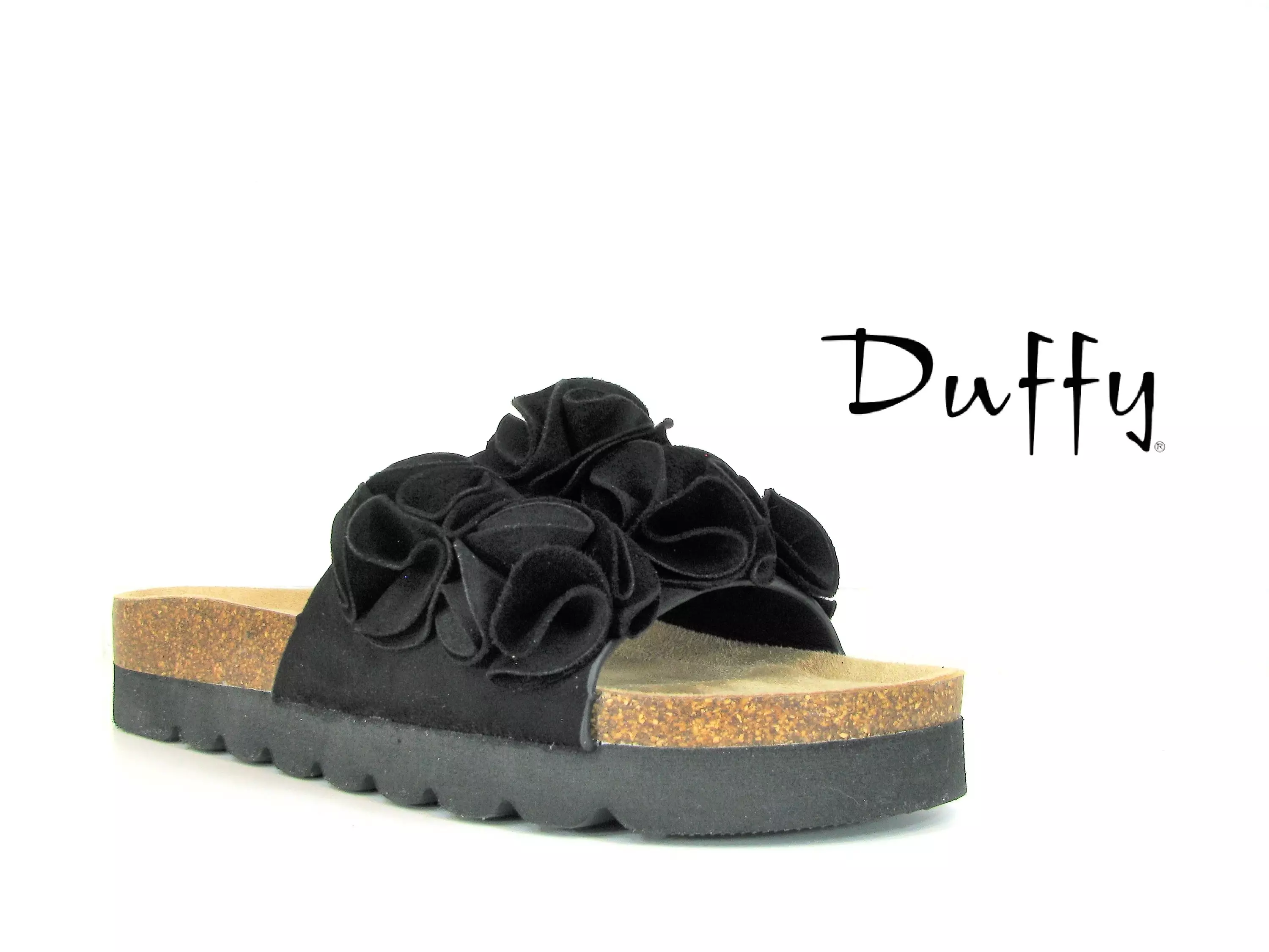 Duffyn paksupohjaiset pistokkaat. Jalkapöydän päällä leveä tekstiiliremmi, jota koristaa kauniit tektiiliset ruusukkeet. Tekstiilipintainen pohjallinen on kevyesti muotoiltu sekä hyvin pehmustettu. Erityisesti pehmustukseen on kiinnitetty huomiota kantapään kohdalla. Ulkopohjan korkeus on n. 4cm (pelkkä alaosa n. 2cm.)