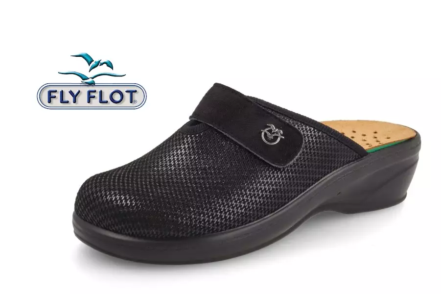 FlyFlotin umpikärkiset pistokkaat, jotka soveltuvat niin koti- ja työkengiksi kuin aamutossuiksi. Kengän päälli- ja sisäosat ovat pohjallisen nahkapintaa lukuunottamatta pehmeää tekstiiliä. Päällisessä on kaunista metallinhohtoista kiiltoa. Jalkapöydän päällä olevan tarran avulla kenkä on helppo säätää juuri jalkaan sopivaksi. Nahkapintainen pohjallinen on anatomisesti muotoiltu ja muokkautuu jalan painon alla juuri jalkaan sopivaksi. Hyvä iskuvaimennus sekä Anti-slip pito lisäävät kengän turvallisuutta sekä käyttömukavuutta. Pohjan korkeus kannassa on n. 4,5 cm. Normaali/tilavahko lesti. Valmistettu Italiassa.