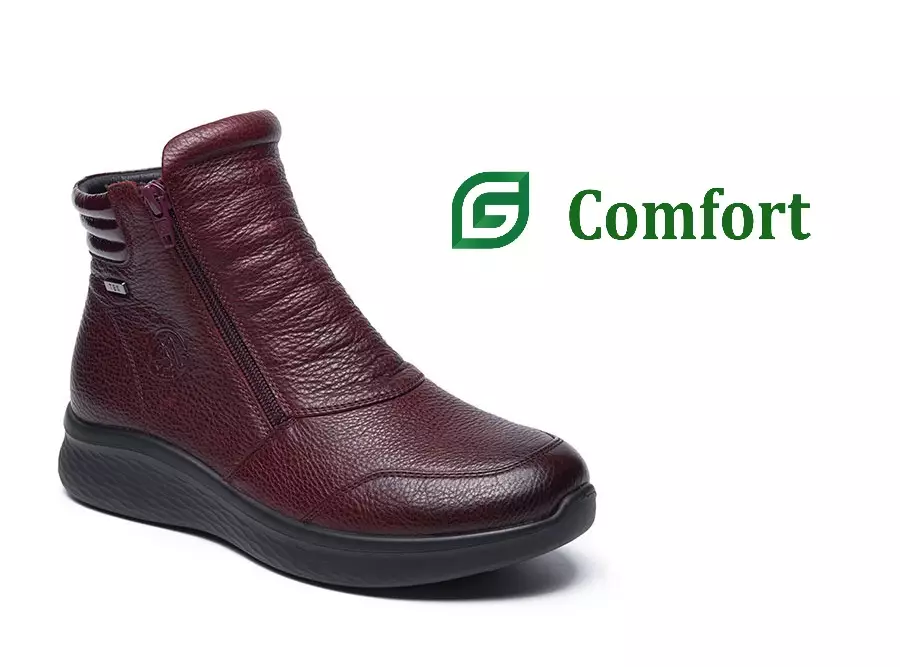 G Comfortin tilavalestiset TEX-nilkkurit, joiden päälliosat on valmistettu aidosta ja laadukkaasta nahasta. Etuosan molemmilla puolilla vetoketju mahdollistamassa helpon pukemisen kengän suuaukon laajan avautumisen ansiosta. Kengän päällisen TEX-ominaisuus auttaa kenkää kestämään tehokkaasti vettä ehkäisten jalkaa kastumasta. Kengissä on kevyt tekstiilivuori. Irrotettava nahkapintainen pohjallinen on hyvin pehmustettu. Näissä kävelykengissä on tukeva, hyvin muotoiltu ja joustava Ultra Antislip TPU-pohja. Pohja on hyvin kuvioitu ja ehkäisee tehokkaasti pohjan luistoa erilaisilla pinnoilla. Pohjan korkeus kannassa n. 3,5 cm ja päkiän alla n. 2 cm. Tässä kengässä on tilava lesti, joten kenkä sopii myös enemmän tilaa tarvitsevaan jalkaan. Löydät tämän kengän mustana tuotenumerolla P-825S.