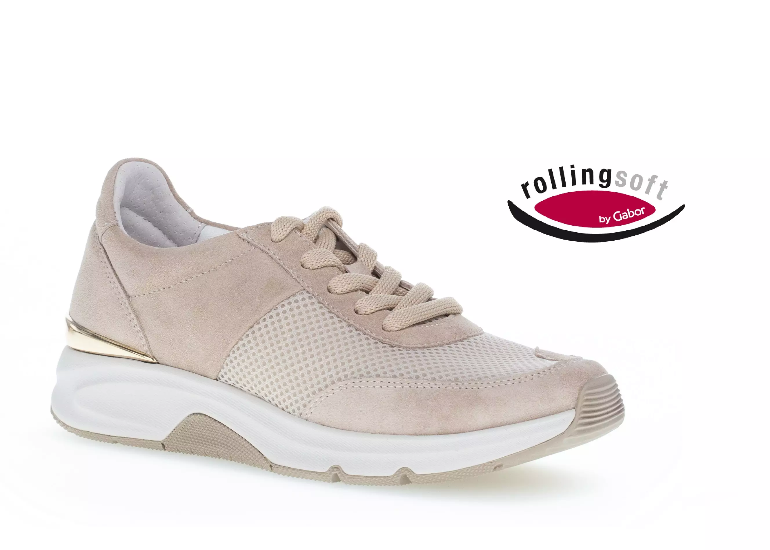Gaborin suositut Rolling Soft -lenkkarit. Lenkkarin päälliosat on valmistettu laadukkasta ja aidosta mokkanahasta sekä ihanteellisen hengittävästä mesh-tekstiilistä. Edessä nauhakiinnitys, jonka avulla kenkä on helppo säätää juuri jalkaan sopivaksi.