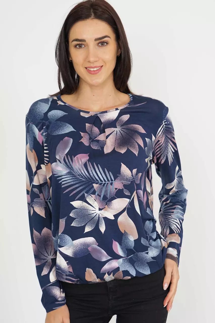 Gabriella K:n pitkähihainen paita, jossa kaunista lehtikuosia. Pyöreä pääntie. Helmassa siro kuminauha.