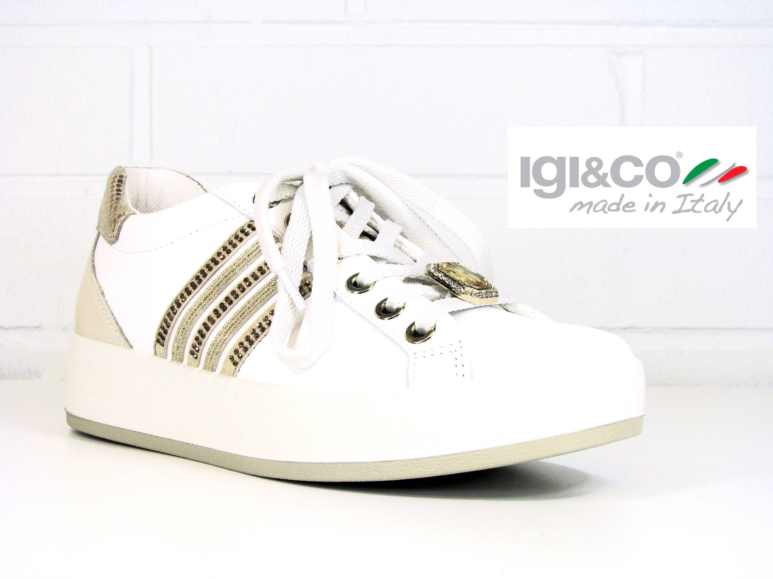 Igi&Co:n muodikkaat paksupohjaiset kävelykengät, joiden päälliosat on valmistettu synteettisestä aidosta ja laadukkaasta nahasta. Kenkää somistaa kauniit yksityiskohdat, joktka värissä valkoinen ovat kulansävyiset ja värissä bees hopeansävyiset. Edessä nauhakiinnitys, jonka avulla kenkä on helppo säätää juuri jalkaan sopivaksi. Nauhoituksen ruunaa niiden alaosan kaunis koristekivi. Sisäosissa kevyt tekstiilivuori lukuunottamatta irrotettavan pohjallisen nahkapintaa. Paksu, anatomisesti muotoiltu pohjallinen on rei'itetty hengittäväksi ja sen tilalle on mahdollista vaihtaa toinen pohjallinen. Näissä ihanteellisen kevyissä tennareissa on paksu kumisekoitepohja, jossa on huomioitu myös hyvä iskunvaimennus. Pohjan korkeus kannassa on n. 4-4,5cm ja päkiän kohdalla n. 3cm. Normaali lesti.