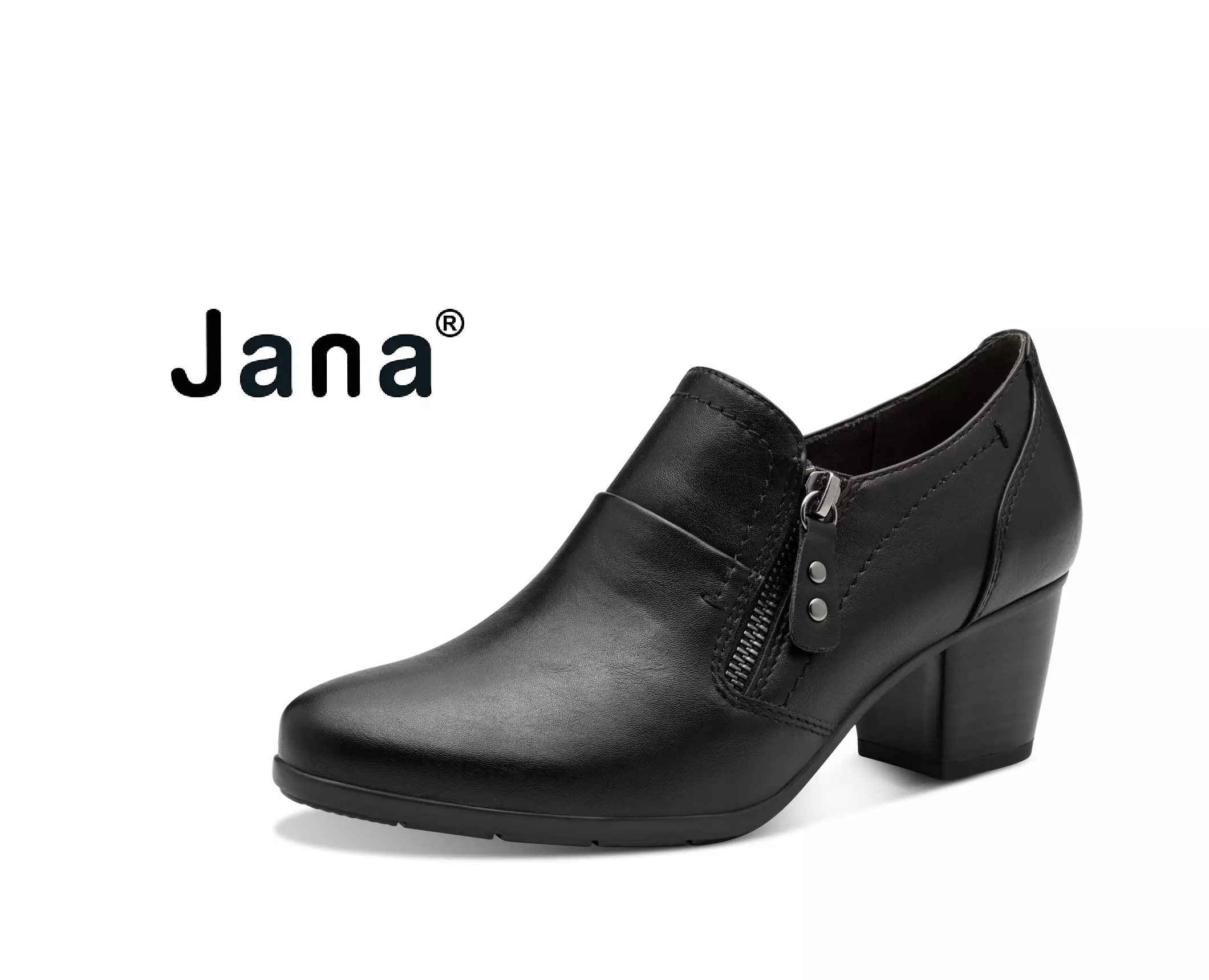 Janan korollinen kävelykenkä, jonka päällinen on valmistettu laadukkaasta nahkajäljitelmästä. Etuosan ulkosyrjällä vetoketju, jonka ansiosta kenkä on helppo pukea. Sisäsyrjällä venykepala tuomassa jalkapöydän päälle tarvittaessa hieman lisätilaa ja mahdollistamassa parhaan mahdollisen istuvuuden. Hyvin pehmustettu tekstiilipintainen pohjallinen. Tukevan, keskelle kantapäätä viistetyn koron korkeus on n. 5,5 cm. Päkiän kohdalla ulkopohja on miellyttävän joustava. Kengässä on hieman normaalia lestiä tilavampi H-lesti.