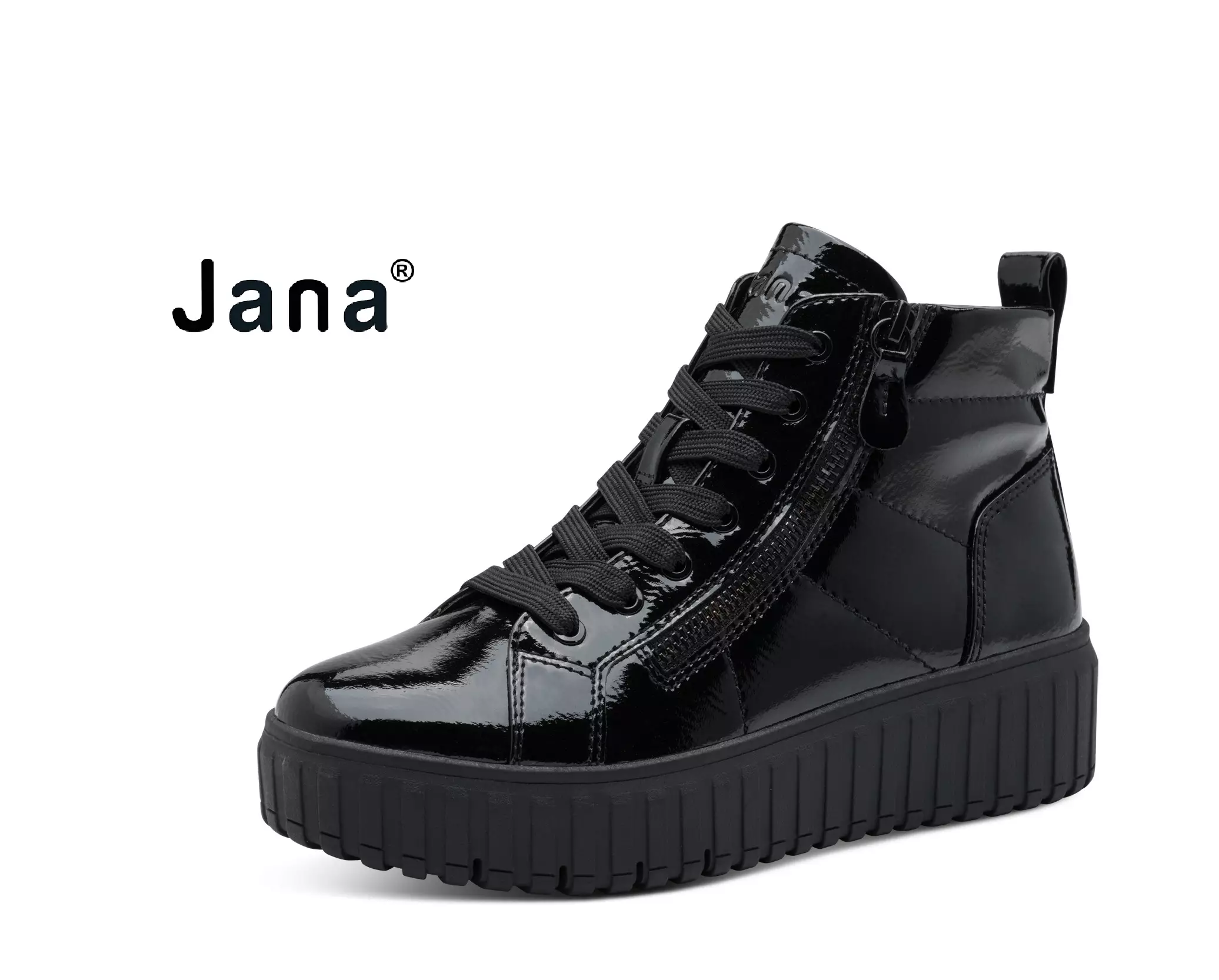 Janan paksupohjaiset lakeeriilkkurit, joiden nahkajäljitelmäpäällinen on päällystetty upealla lakeeripinnalla. Edessä nauhakiinnitys, jolla kengät on helppo säätää sopiviksi. Lisäksi sisäsyrjällä avattava vetoketju helpottamassa kengän pukemista. Ulkosyrjällä vetoketju somisteena (ei avattava). Nilkkureissa on pohjallisen pintaa myöten miellyttävän pehmeä ja kevyehkö tekstiilivuori. Hyvin kuvioidun pohjan korkeus kannssa on n. 4,5 cm ja päkiän kohdalla n. 3 cm. Kengässä on hieman normaalia lestiä tilavampi H-lesti. Tämä kenkä on valmistettu 100% vegaanisista materiaaleista.
