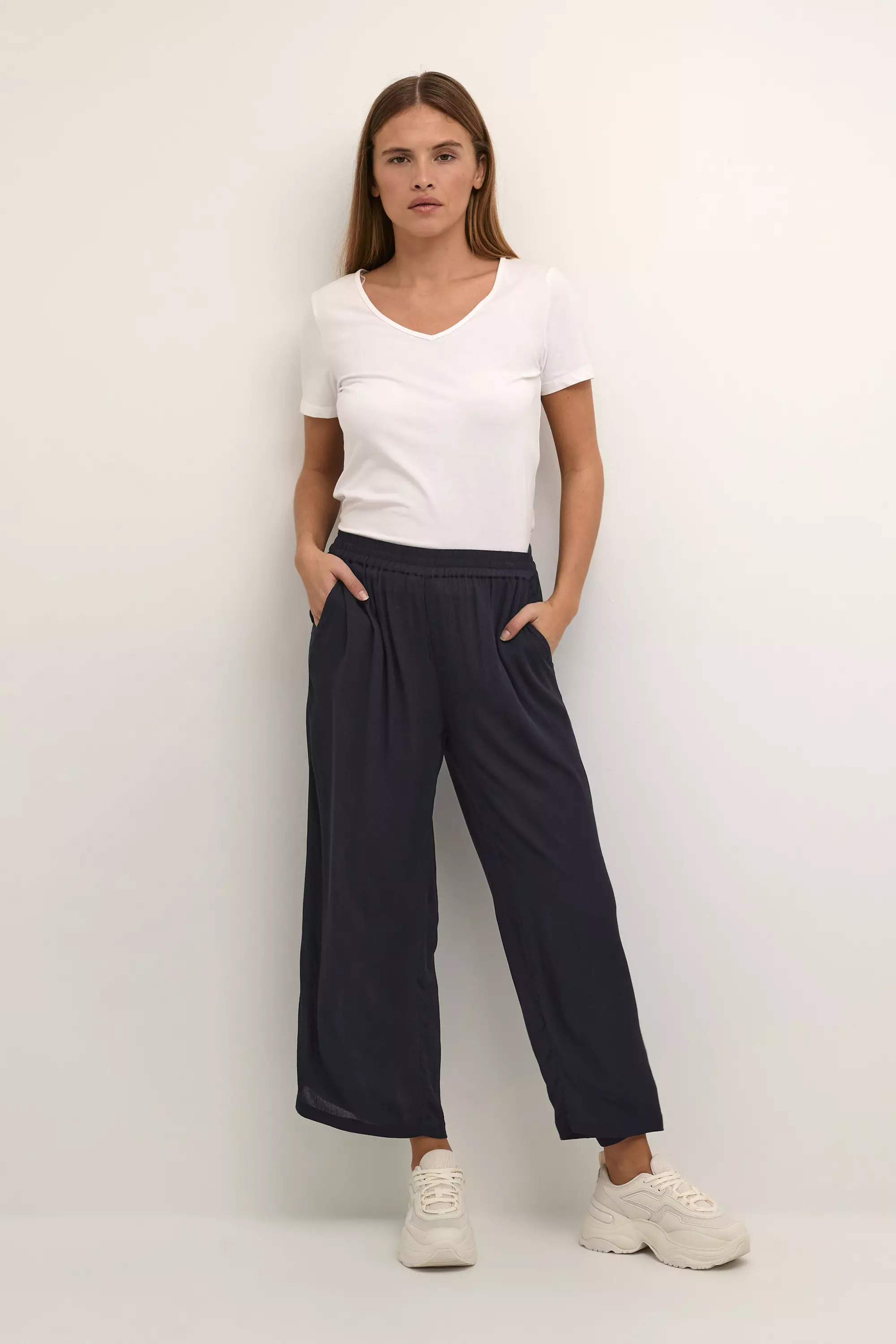 Kaffen nilkkamittaiset KAdacia housut, joissa kauniisti laskeutuvat suorat lahkeet sekä joustava vyötärö. Molemmilla sivuilla taskut.