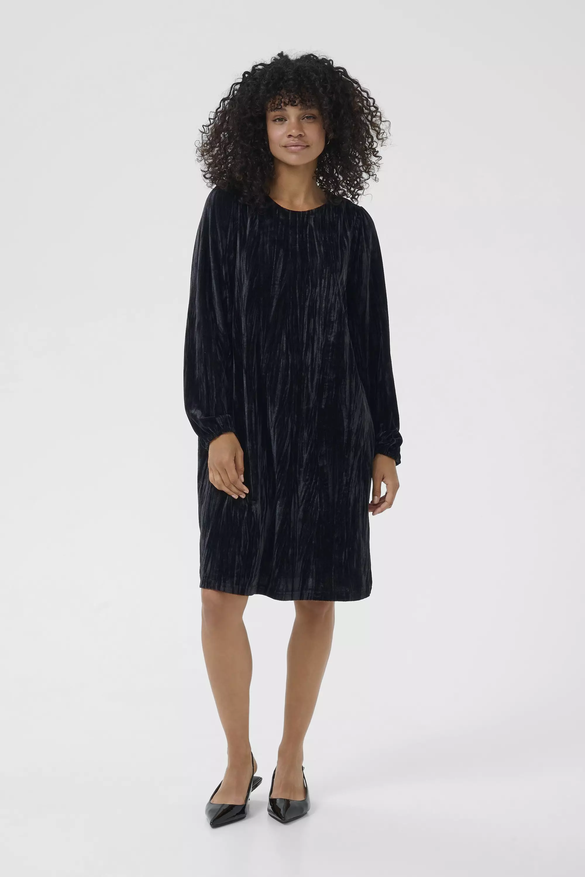 Kaffen samettimekko, jossa täysmittaisten hihojen suissa sirot kuminauhat. Pyöreähkö pääntien, jossa takana yksi nappi. Kaunis samettimainen pinta sopii erityisen hyvin juhlavaankin tilanteeseen.