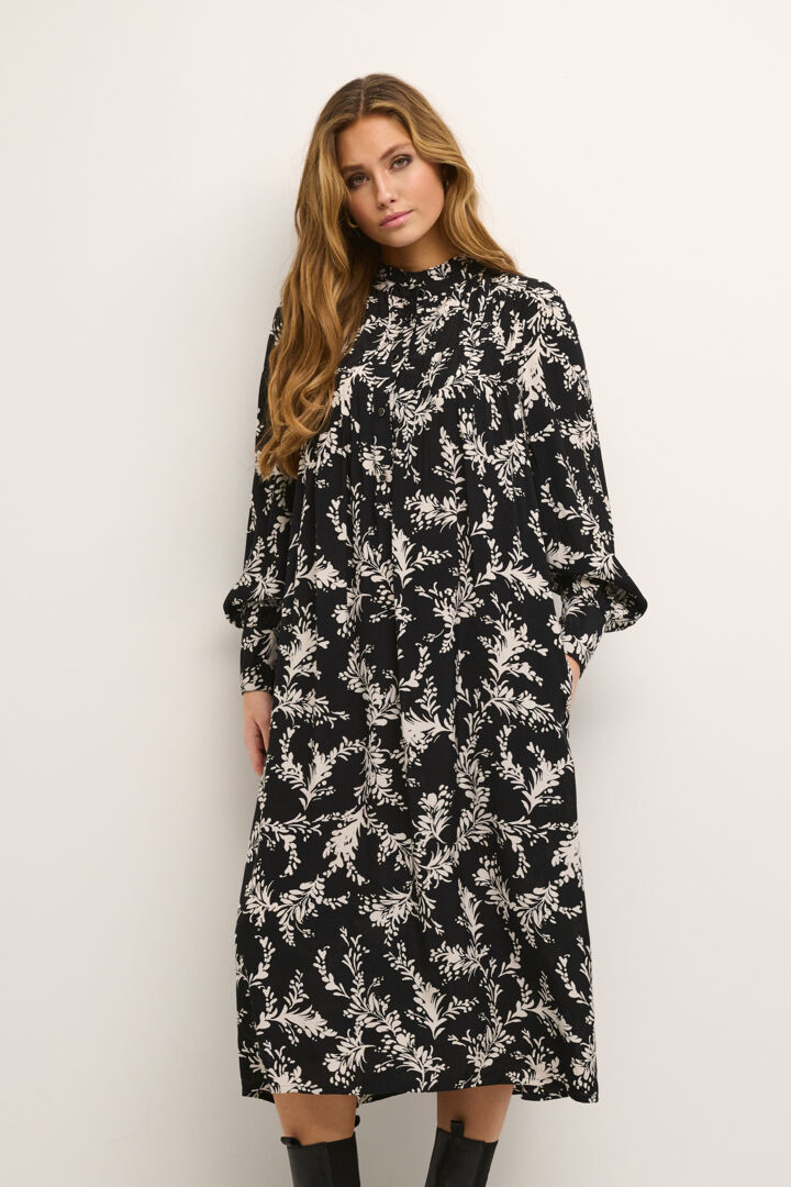 Kaffen pitkähihainen KAemira mekko. Pyöreässä pääntiessä siro ryptys, sekä viisi kiiltäväpintaista nappia. Molemmilla sivuilla taskut. Ihanan kevyesti laskeutuva kiiltävä kangas tuo mekkoon juhlavaa ja huoliteltua ilmettä.