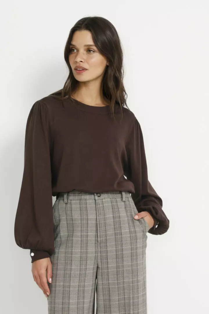 Kaffen KAjessa neulepusero, jossa korkea pyöreä pääntie. Hihojen kaunis pyöreä muoto tuo paitaan näyttävyyttä. Hihojen suissa kolme koristetimanttia.