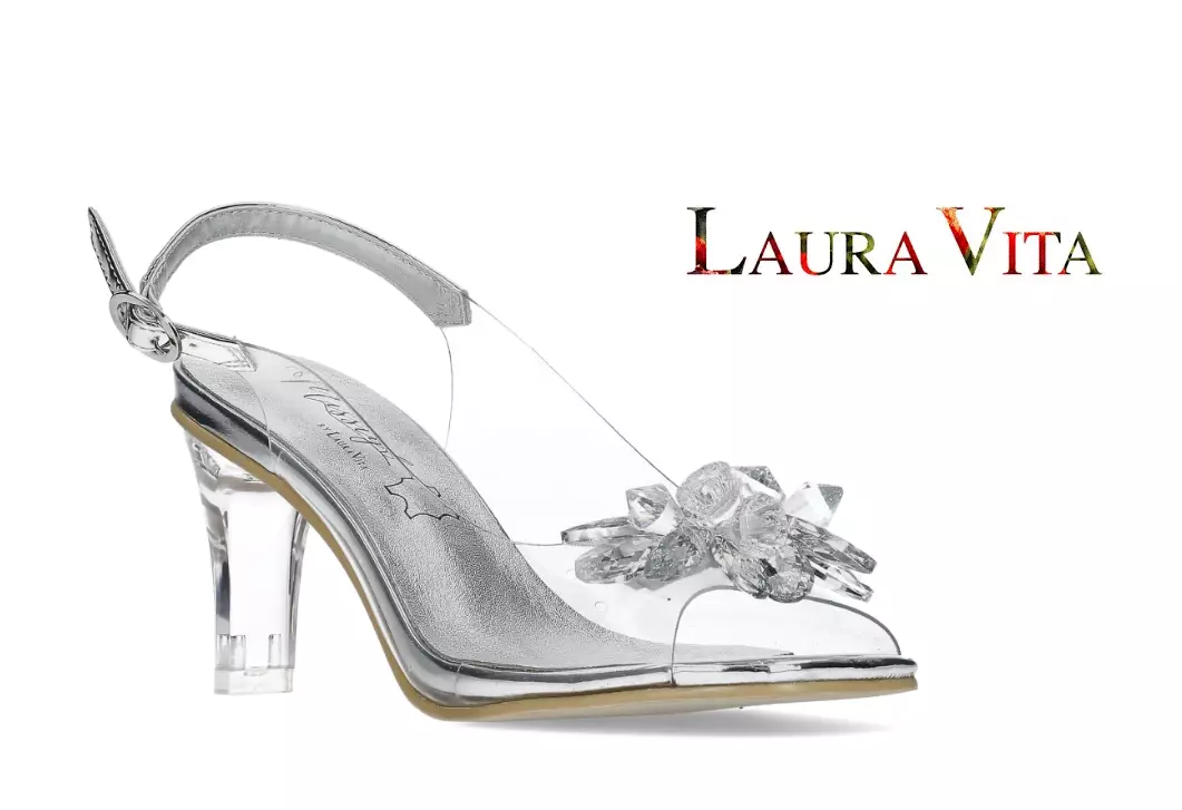 Laura Vitan luoman Misstyl-sarjan upeat lasikenkämäiset slingback -korkokengät, joiden päälliosat on valmistettu joustavasta muovista. Avonainen kärki, jonka päällä upea monen mallisista koristekivistä tehty näyttävä yksityiskohta. Slingback-mallisessa kannassa soljella säädettävä remmi. Hyvin pehmustetun pohjallisen pinta on aitoa ja laadukasta nahkaa pientä kärkipalaa lukuunottamatta. Tukeva ja tarvittaessa tanssimiseenkin soveltuvan tasainen pohja. Upean läpinäkyvän koron korkeus pohjallinen mukaanlaskettuna n. 8 cm.