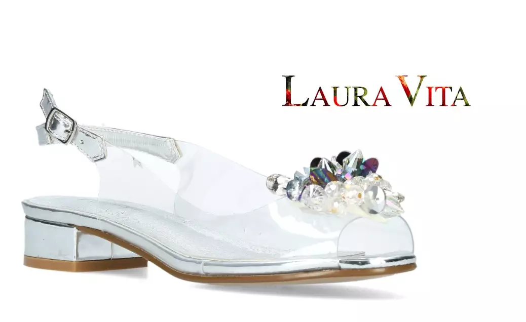 Laura Vitan luoman Misstyl-sarjan upeat lasikenkämäiset slingback -avokkaat, joiden päälliosat on valmistettu joustavasta muovista. Avonainen kärki, jonka päällä upea koristekivistä ja paljeteista tehty näyttävä yksityiskohta. Slingback-mallisessa kannassa soljella säädettävä remmi. Hyvin pehmustetun pohjallisen pinta on aitoa ja laadukasta nahkaa pientä kärkipalaa lukuunottamatta.Tukeva ja tarvittaessa tanssimiseenkin soveltuvan tasainen pohja. Tukevan koron korkeus n. 3 cm.