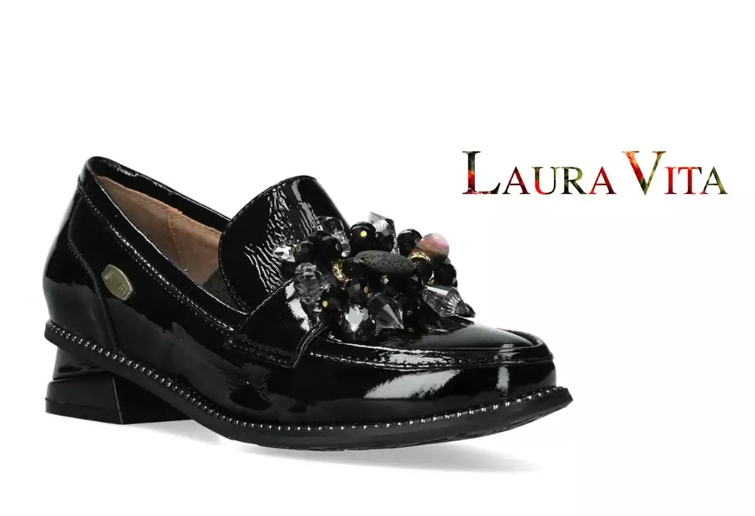 Laura Vitan loafer-mallinen Ibcihalo 10 -lakeerikävelykenkä, jonka päällinen on valmistettu aidosta ja laadukkkasta nahasta. Edessä upea koristetimantti, -paljetti ja -kivi koriste. Kengän sisäosat ovat pohjallisen pintaa myöten miellyttävän pehmeää aitoa nahkaa. Pohjan yläreunaa kiertää siro niittirivi. Kauniisti viistomaisesti muotoillun kannan korkeus on n. 3 cm. Normaali lesti. Miettiessäsi kahden koon välillä suosittelemme tilaamaan isomman koon.