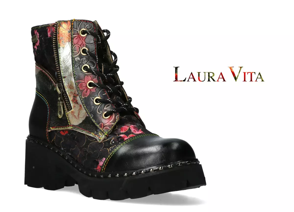 Laura Vitan upeat Kleo 11 maiharit, joiden pääliosat on valmistettu laadukkaasta aidosta nahasta sekä kestävästä tekstiilistä. Kengän vartta somistaa kaunis kukkateemainen kuosi, jonka metallinhohtoinen osio luo kenkään ylellisen tyylikästä ilmettä. Tyylikkään ilmeen viimeistelee sateenkaaren väreissä liukuva siisti tikkaus. Sisäsyrjän vetoketju helpottaa ja nopeuttaa kengän pukemista jalkaan, ja etuosan nauhoitus tuo kenkään hyvin säätövaraa. Kengässä on kevyt ja pehmeä tekstiilivuori sekä nahkapintainen hyvin pehmustettu pohjallinen. Myös kengän suuaukko sekä vetoketjun tausta ovat aitoa nahkaa. Tukevan kumisekoitepohjan yläreunaa kiertää tyylikäs niititys. Pohjan korkeus kannassa on n. 5,5 cm ja päkiän kohdalla n. 3 cm.