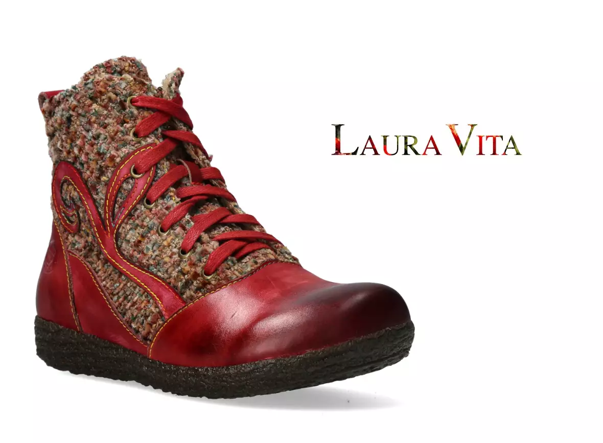 Laura Vitan upeat Gocno 16 -nilkkurit, joiden pääliosat on valmistettu laadukkaasta aidosta nahasta sekä kauniista tekstiilistä. Kengän vartta koristaa kaunis ja pehmeä pikselimäisesti värjätty tekstiili. Ulkosyrjällä kaunis lehteä muistuttava nahkapala. Sisäsyrjän vetoketju helpottaa ja nopeuttaa kengän pukemista jalkaan, ja etuosan nauhoitus tuo kenkään hyvin säätövaraa. Sisäosissa irrotettavan ja pehmustetun pohjallisen pintaa myöten lämmin ja pehmeä teddy-tekstiilivuori. Joustava ja kuvioitu kumipohja ehkäisee tehokkaasti luistamista monilla erilaisilla pinnoilla. Pohjan korkeus kannassa on n. 2 cm. Löydät tämän kengän värissä punaruskea tuotenumerolla 72221.
