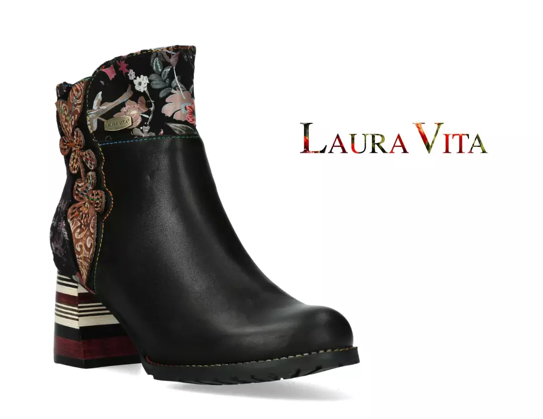 Laura Vitan upeat Idcorao 03-korkonilkkurit, joiden pääliosa on pääosin valmistettu laadukkaasta aidosta nahasta sekä kauniisti kuvioidusta tekstiilistä. Yläreunassa ja kannassa kaunista kukkakuviointia ja ulkosyrjällä upea nahkasomiste. Ilmeen kruunaa sateenkaaren väreissä liukuva tikkaus. Sisäsyrjän alas asti ulottuva vetoketju helpottaa kengän pukemista. Sisäosissa kevyt ja pehmeä tekstiilivuori sekä nahkapintainen hyvin pehmustettu pohjallinen. Myös kengän suuaukko sekä vetoketjun tausta ovat aitoa nahkaa. Kumisekoitepohja on kevyesti kuvioitu ja se ehkäisee tehokkaasti luistamista monilla erilaisilla pinnoilla. Upeasti raidoitetun koron korkeus on n. 6,5 cm. Normaali lesti.