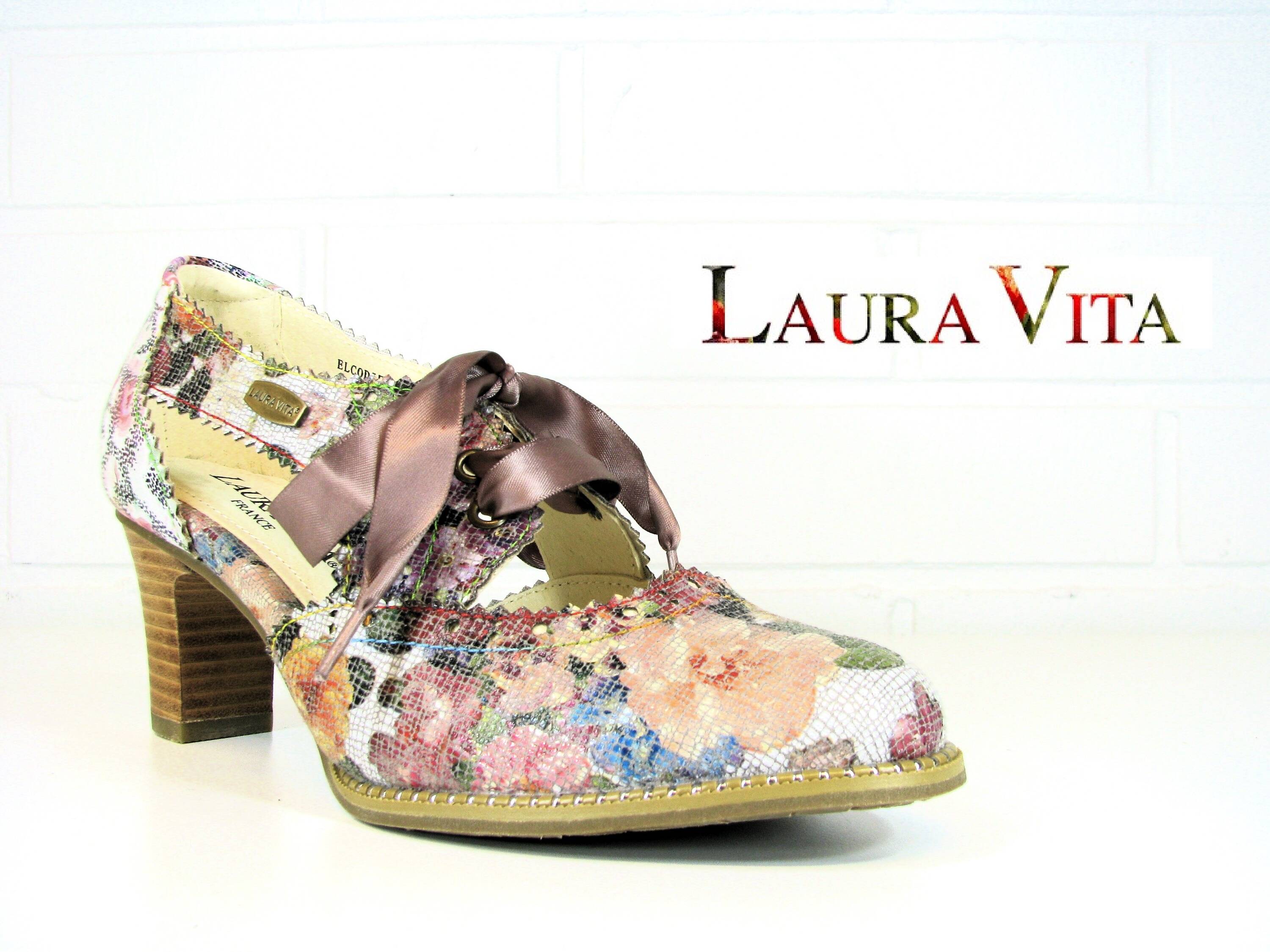 Laura Vitan upeat kävely-/juhlakengät. Päällinen on valmistettu aidosta ja laadukkaasta nahasta sekä tekstiilistä. Edessä siro kangasrusetti, jolla kengän saa säädettyä jalkaan sopivaksi. Kengän ilmeen kruunaa sateenkaaren väreissä liukuva tikkaus. Umpinainen kärki, kantakappi sekä tukeva korko tekee kengästä tukevan käyttää. Sisäosat ovat pehmustettua pohjallista myöten kauttaaltaan aitoa ja laadukasta nahkaa. Päkiän alta kuvioitu kumisekoitepohja on pitävä ja tukevan koron korkeus on n. 6-6,5cm.