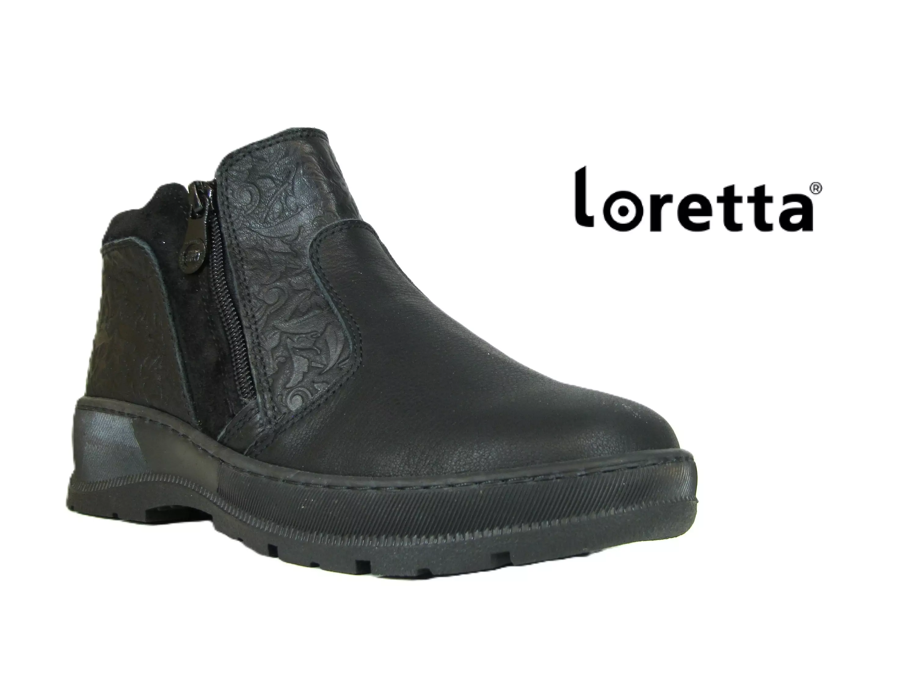 Loretan siisti nilkkuri, jonka päälliosat on valmistettu aidosta ja laadukkaasta nahasta. Etuosan molemmilla puolilla vetoketjut helpottamassa kengän pukemista. Sisäosissa on kevyt tekstiilivuori... Lue lisää