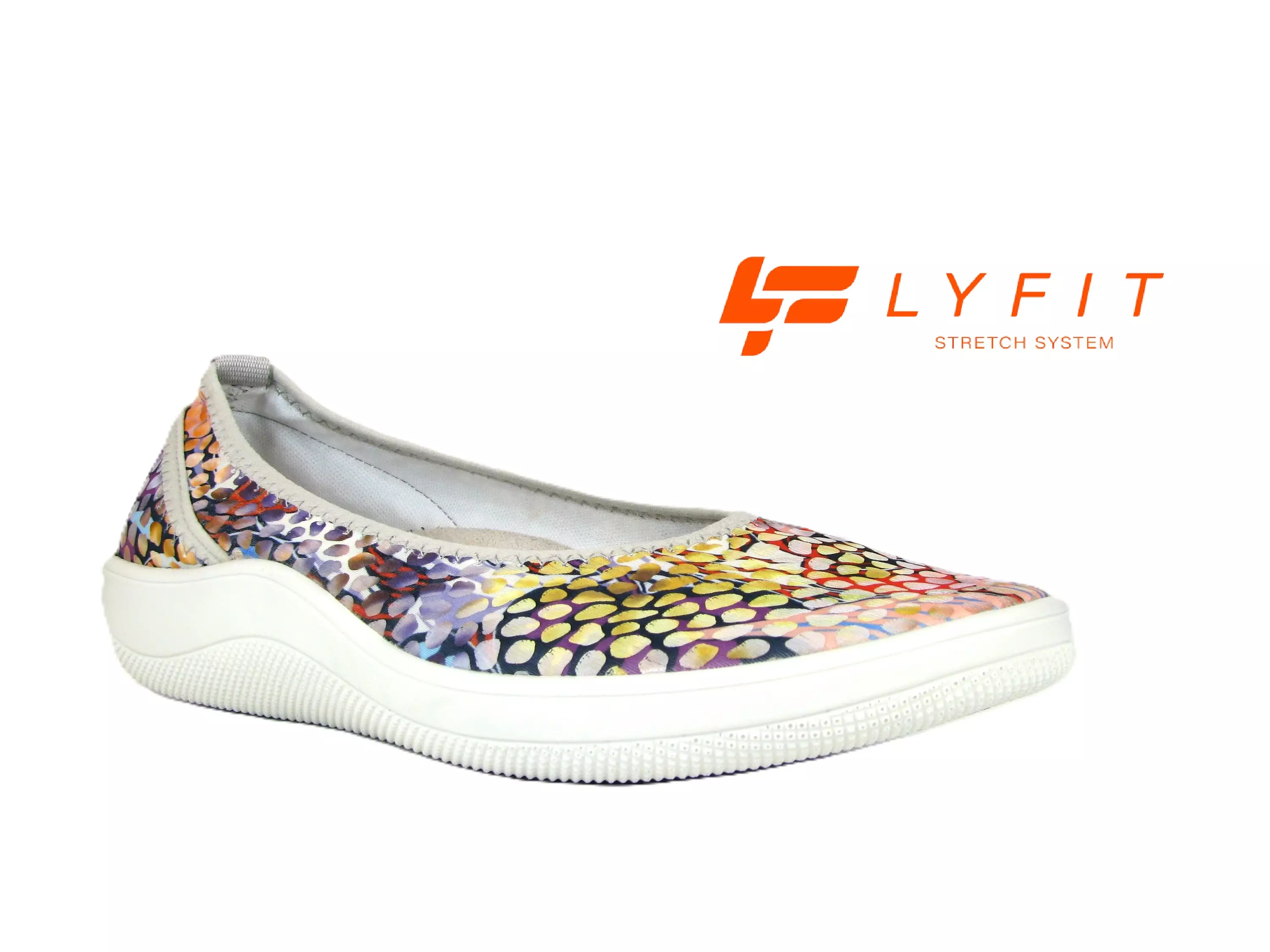 Lyfitin tilavat balleriinat, joiden päällinen ja sisäosat on valmistettu pehmeästä ja kestävästä tekstiilistä. Kengässä on kaunis värikäs kuosi, joka on helppo yhdistää moninaisen värimaailmansa ansiosta asuun kuin asuun! Irrotettava pohjallinen on hyvin pehmustettu ja muotoiltu. Tässä kävelykengässä on erityisen tilava lesti. Joustava ja taipuisa, mutta myös tukeva pohja on kevyesti kuvioitu ja ehkäisee luistamista monilla eri pinnoilla. Pohjan korkeus kannassa on n. 3 cm. Kengät on valmistettu Portugalissa.