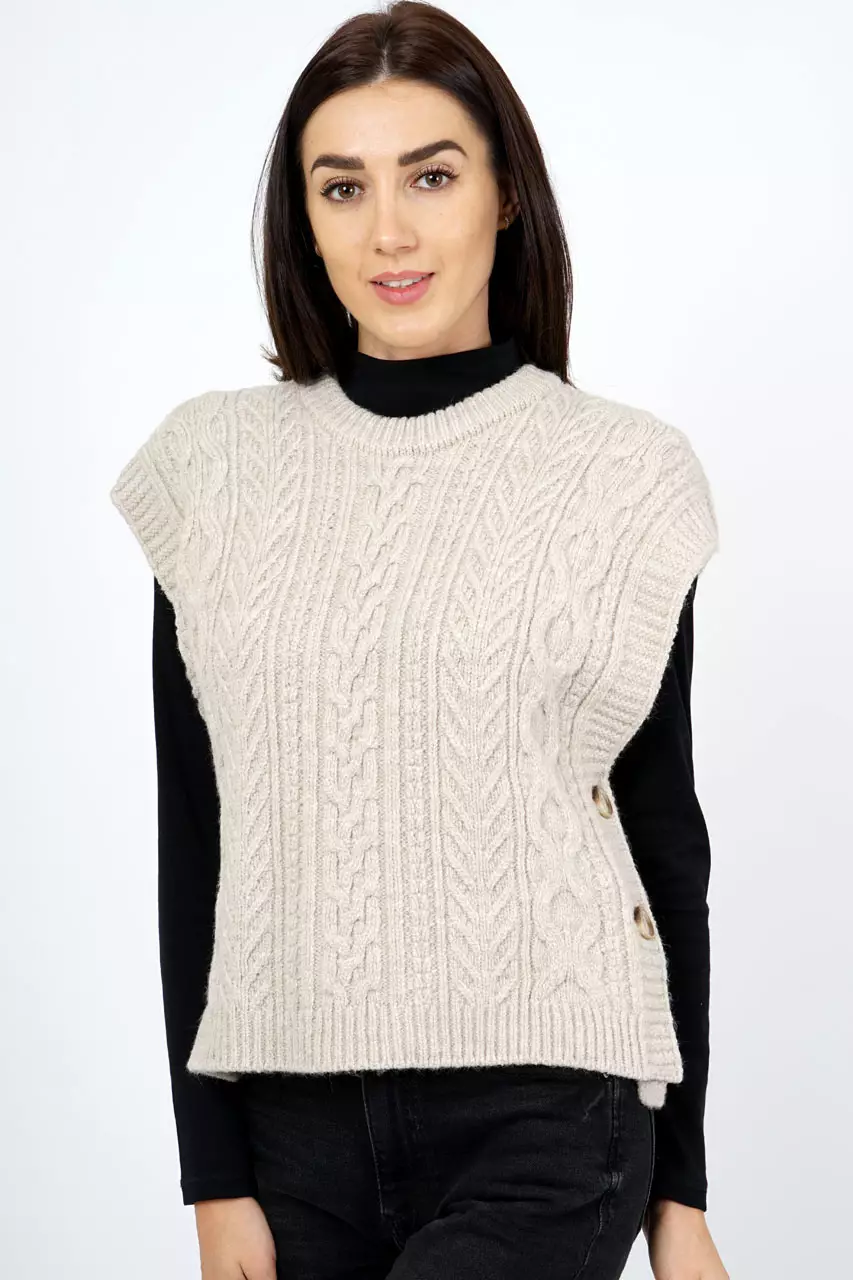 MXO:n neuleliivi, jossa kaunista palmikkopintaa. Pyöreä kaula-aukko. Molemmilla sivuilla kaksi nappia.