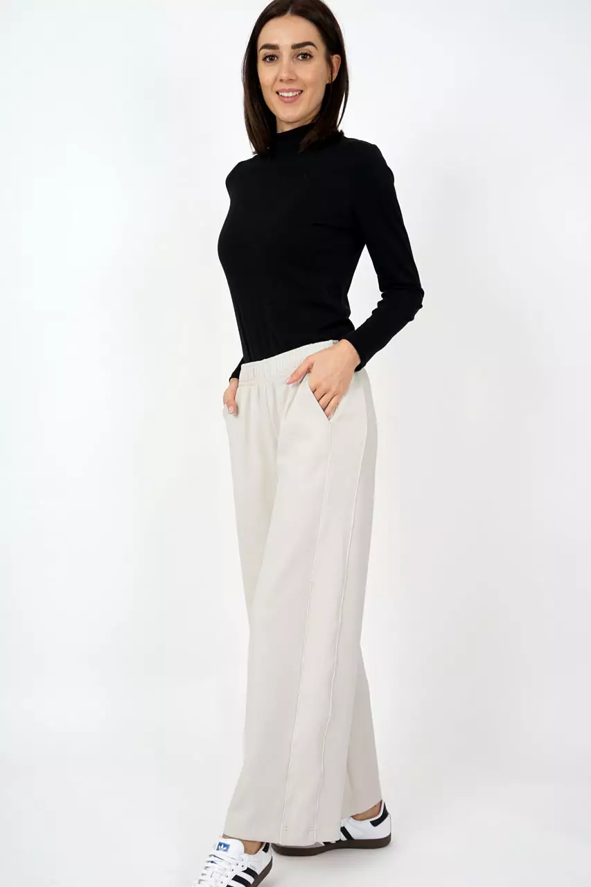 MXO:n suoralahkeiset housut, joissa joustava vyötärö. Lahkeiden ulkosivuilla kauniit valkoiset raidat. Molemmilla sivuilla taskut. Housujen väri on luonnossa beesimpi, kuin kuvassa.