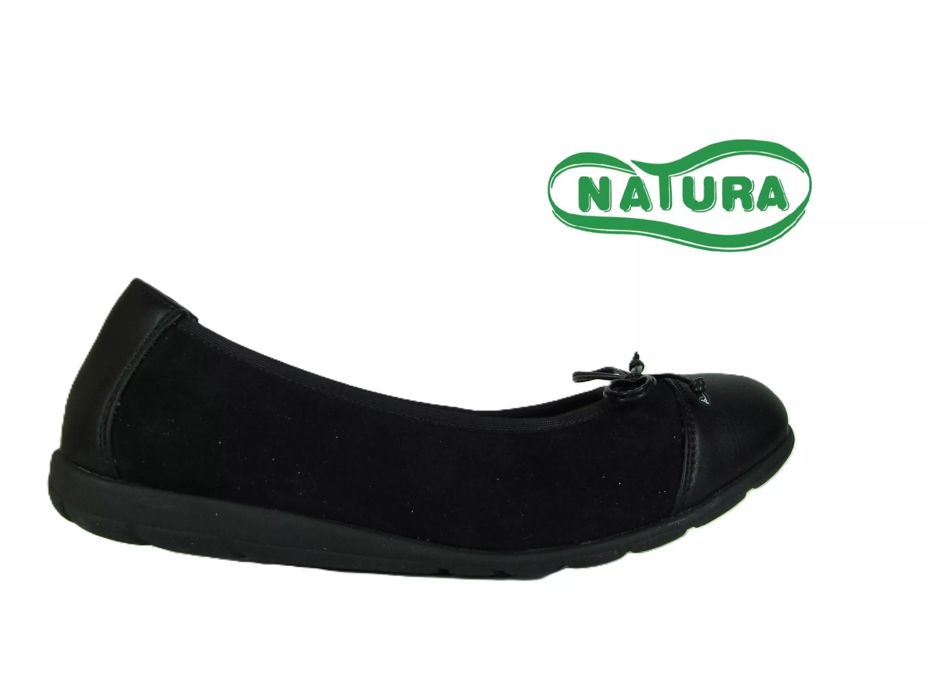 Naturan tilavat Badia-balleriinat, joiden päälliosat on valmistettu aidosta ja laadukkaasta nahasta. Etuosan kaunis rusetti tuo kenkään kaunista ilmettä ja herkkyyttä. Kengän suuaukon joustinnauha mahdollistaa parhaan mahdollisen istuvuuden. Kengässä on hyvin pehmustettu nahkapintainen pohjallinen. Joustavan ja taipuisan ulkopohjan korkeus kannassa on n. 2 cm. Tilavahko lesti.