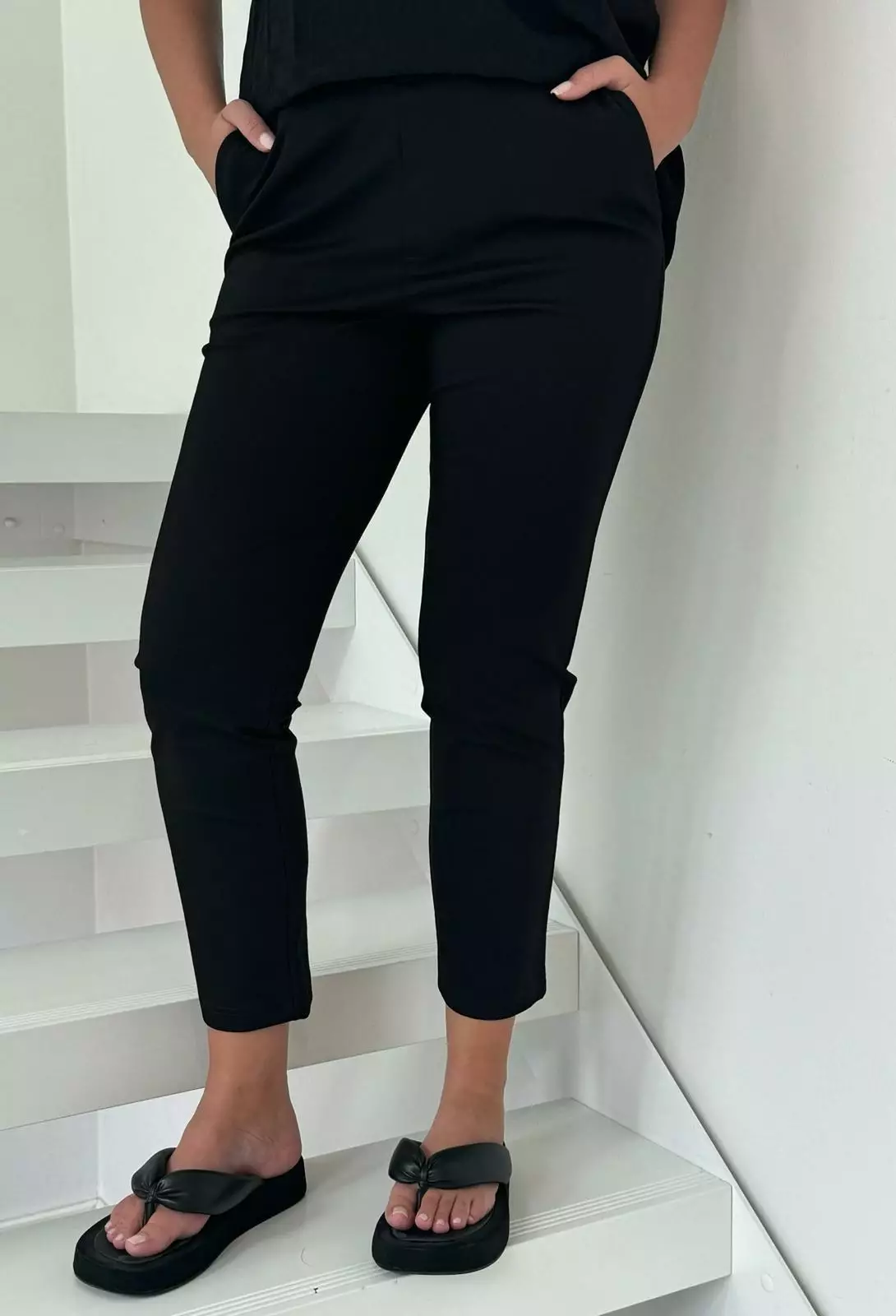 Niccolei housut, jossa hieman vajaamittainen kapeneva lahje. Vyötäröllä joustava kuminauha ja molemmilla sivuilla taskut.