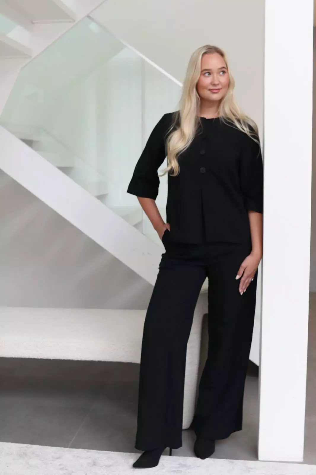 Niccolei housut, jossa hieman levenevä lahje. Vyötäröllä joustava kuminauha ja molemmilla sivuilla taskut.