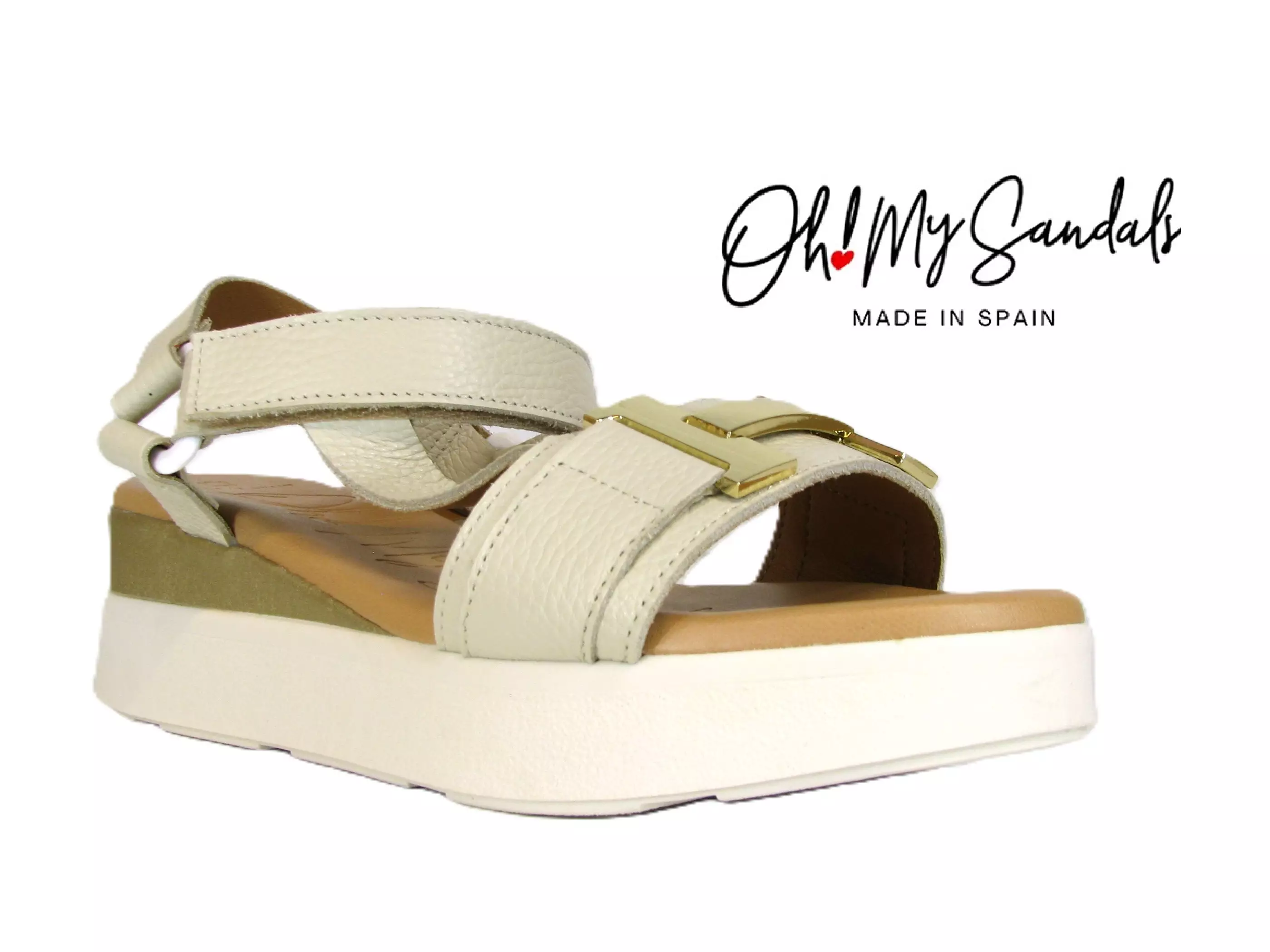 Oh My Sandals -sandaalit, joiden päälli- ja sisäosat on valmistettu kauttaaltaan aidosta ja laadukkaasta nahasta. Jalkapöydn päällä kulkevan nahkaosion päällä kaunis kullanvärinen somistesolki. Nilkan ympäri kiertävässä remmissä tarrakiinnitys. Kantaremmi tukevoittaa sandaalia entisestään. Myös pehmustetun pohjallisen pinta on aitoa nahkaa. Pohjan korkeus kannassa n. 5 cm ja päkiän kohdalla n. 2,5 cm. Normaali lesti. Valmistettu Espanjassa.