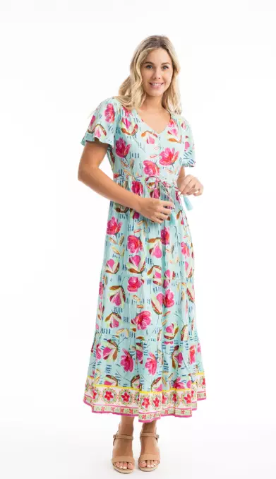 Orientiquen kaunis lyhythihainen täyspitkä mekko. Pyöreästi v-muotoon laskeva pääntie, jonka alapuolella neljä avattavaa nappia. Vyötäröllä kaunis kankaaseen upotettu nyöri, jolla mekon istuuvuutta voi säätää. Nyörin päissä kauniit tasselit.