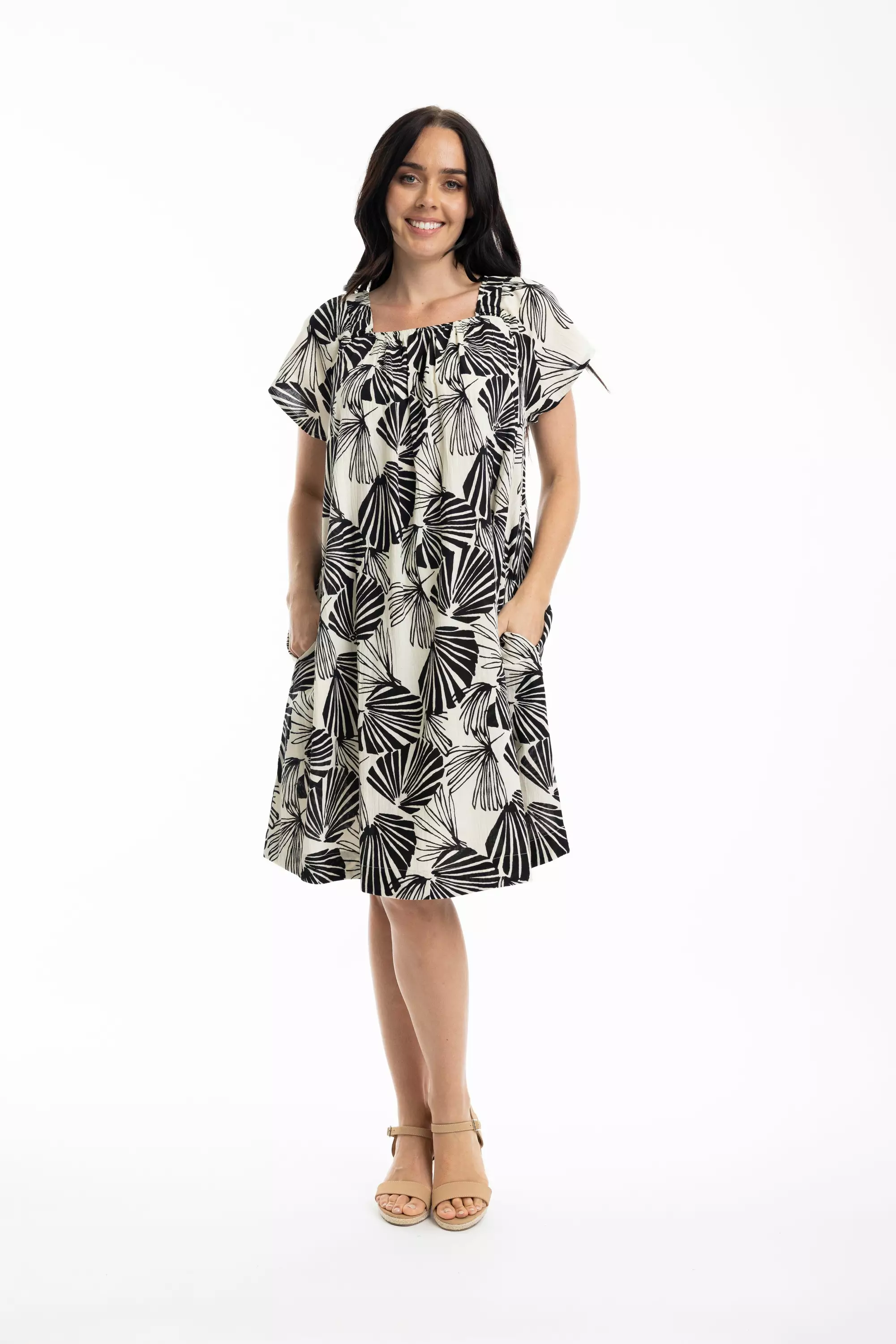 Orientiquen kaunis lyhythihainen mekko, jossa kauniisti laatikkomainen pääntie.
