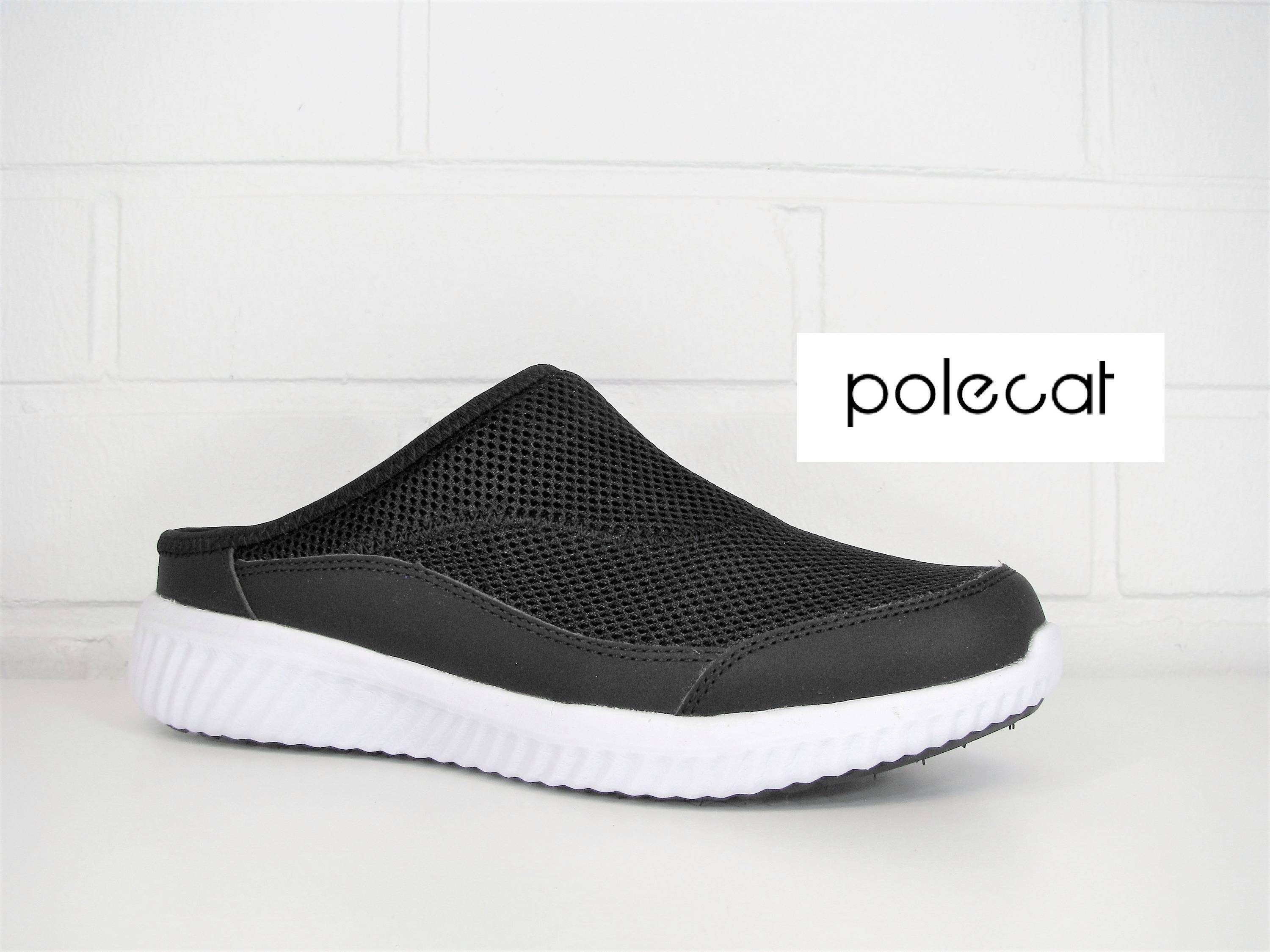 Polecatin sporttiset, mukavan tilavalla lestillä varustetut umpikärkiset pistokkaat. Päällisen tekstiiliosuutta kehystää helposti puhdistettavasta synteettisestä materiaalista valmistetut nahkajäljitelmäosiot, jotka tuovat kenkään käytännöllisyyden lisäksi mukavaa ilmettä. Sisäosat ovat irrotettavaa pohjallista myöten kauttaaltaan mukavan pehmeää tekstiiliä, mikä tekee pistokkaasta mukavan myös paljaaseen jalkaan. Synteettisistä materiaaleista valmistettu pohja on kevyesti kuvioitu. Pohjan korkeus kannassa n. 3,5cm ja päkiän kohdalla n. 2,5cm.