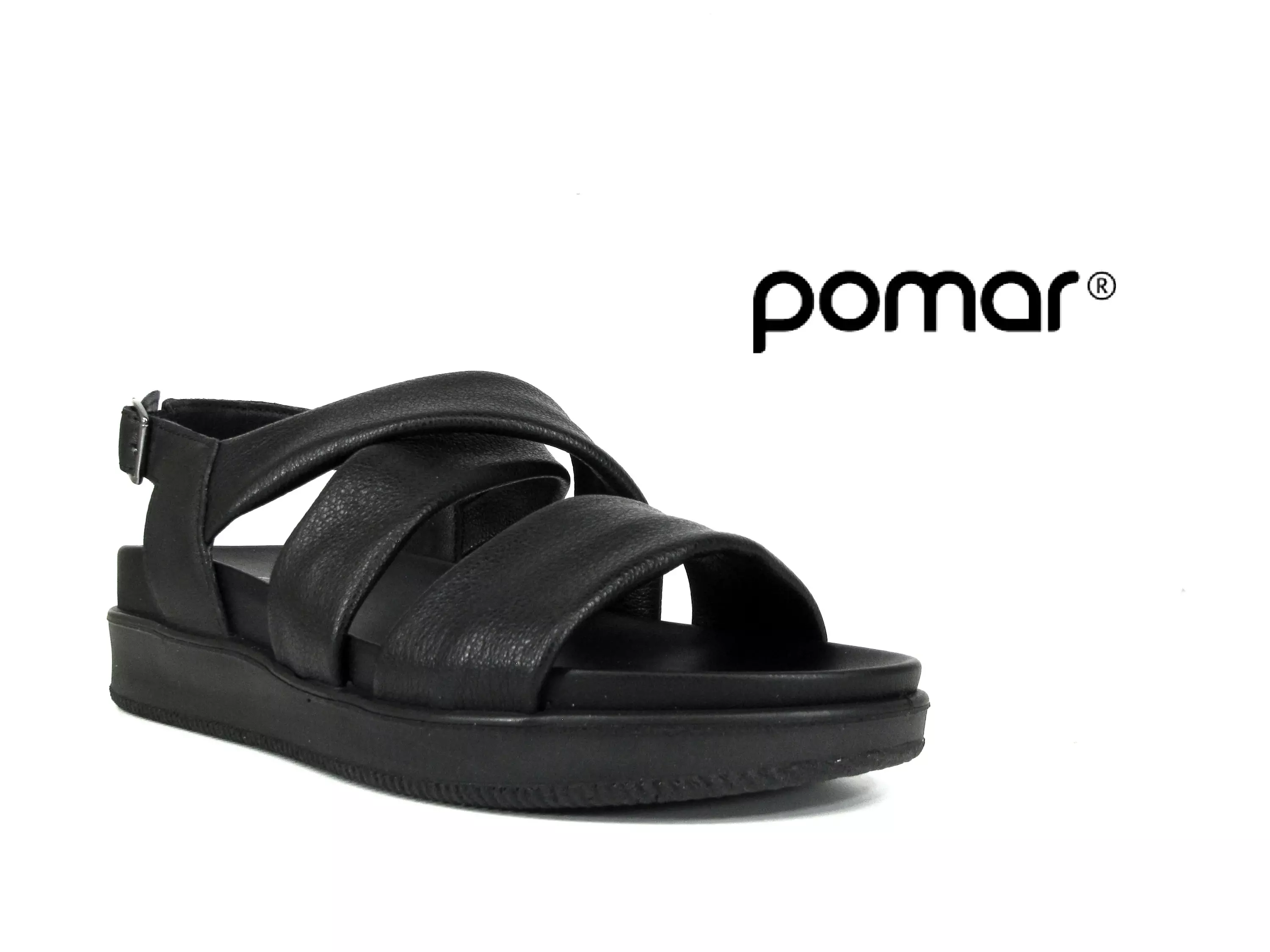 Pomarin Harso-sandaalit, joiden päälliosat on valmistettu aidosta ja laadukkaasta nahasta. Jalakpöydän päältä kulkevat remmit tekvät sandaalista tukevan käyttää. Solkikiinnityksellä ja joustinnauhalla varustettu kantaremmi tuo mahdollisuuden säätä kengän juuri jalkaan sopivaksi. Pohjallinen on kevyesti muotoiltu. Kevyt ja pehmeä polyuretaanipohja on miellyttävän joustava mutta tukeva. Pohjan ja pohjallisen yhteenlaskettu korkeus kannassa on n. 5cm ja päkiän kohdalla n. 3cm. Tässä kengässä on tilava lesti.