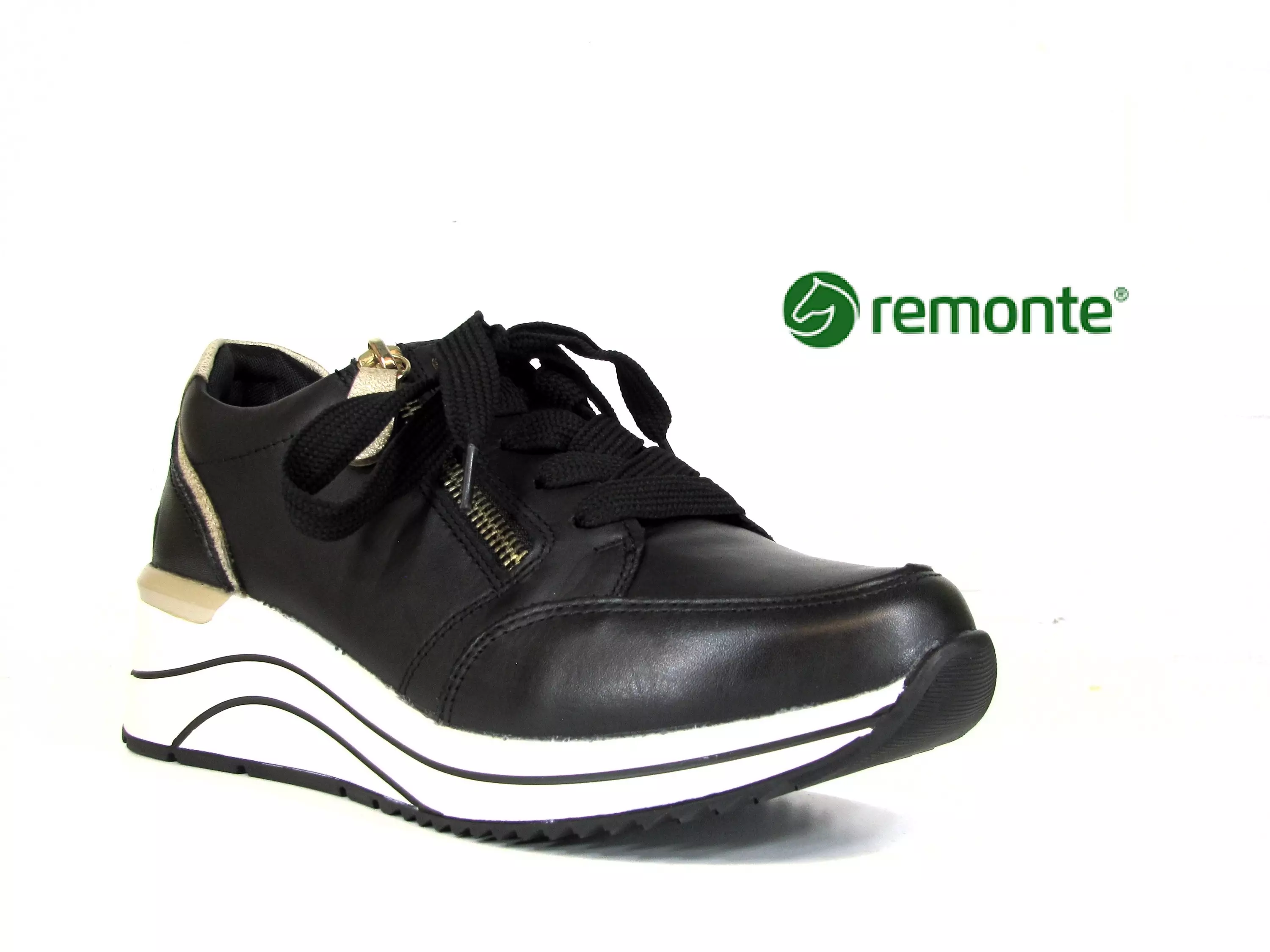 Remonten tyylikkäät kävelykengät, joiden päällinen on valmistettu aidosta ja laadukkaasta nahasta sekä kestävästä nahkajäljitelmästä. Kullansävyiset yksityiskohdat tuovat kenkään tyylikästä ilmettä. Ulkosyrjän vetoketju helpottaa ja nopeuttaa pukemista, ja päällisen nauhat mahdollistavat hyvät säätömahdollisuudet. Remonte Soft-pohjallisen pinta on pehmeää tekstiiliä, ja se on hyvin muotoiltu sekä pehmustetti. Kiilamaisen pohjan korkeus kannassa on n. 5cm.