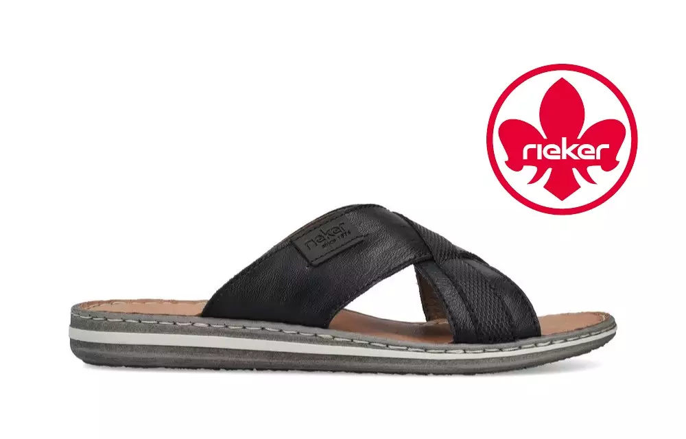 Riekerin pistokasmallinen sandaali, jonka päälliosat on valmistettu päällystetystä nahasta. Edessä kaksi ristiin menevää remmiä, jotka pääsevät liikkumaan mahdollistaen jalkapöydän päälle parhaan mahdollisen istuvuuden. Remmien alapinnat ovat pehmeää nahkajäljitelmää. Pehmustetun Antistress-pohjallisen pinta on aitoa ja hengittävää nahkaa. Kuvioidun ulkopohjan korkeus kannassa on n. 2,5 cm.