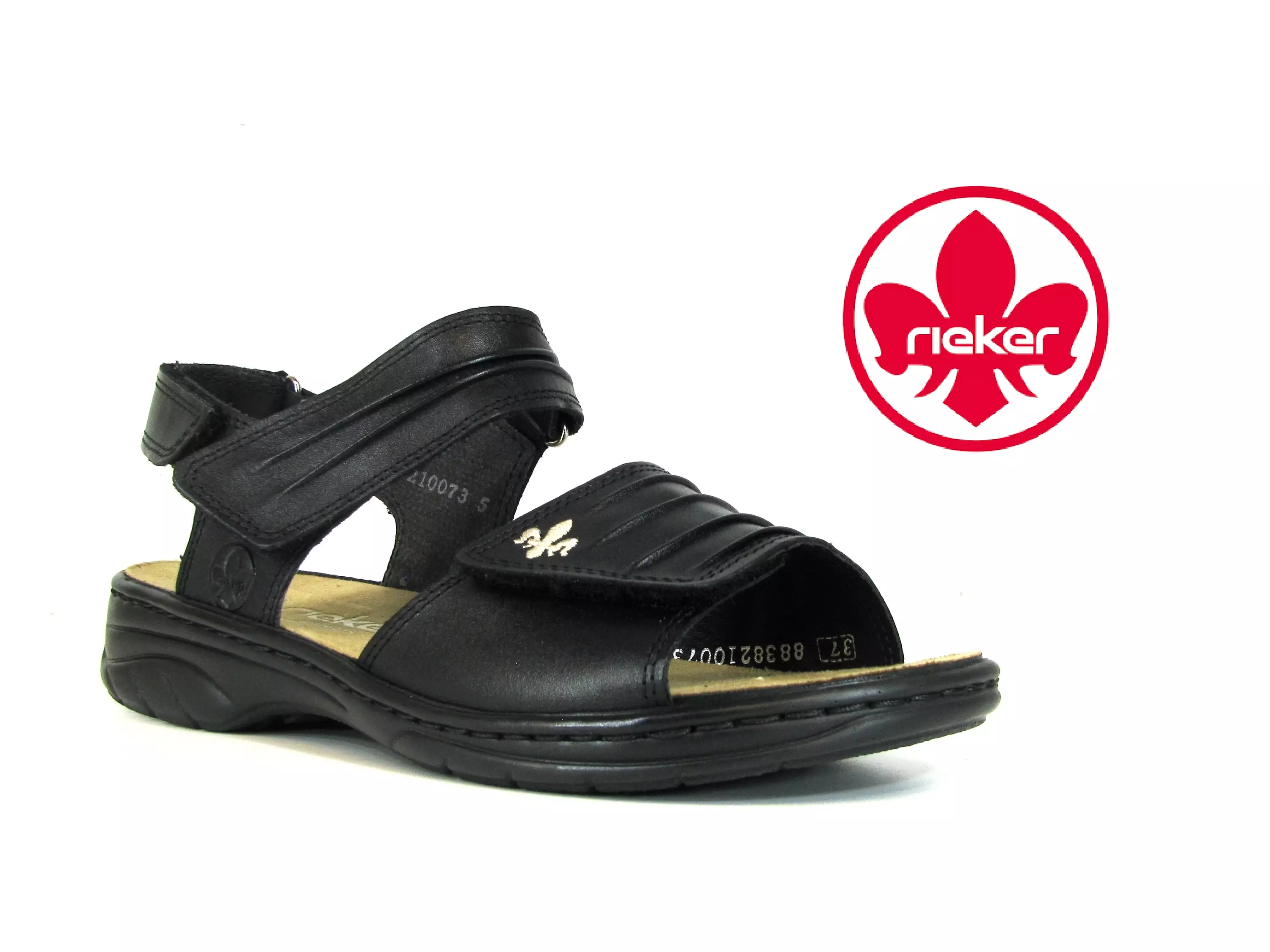 Riekerin kantaremmillinen sandaali, jonka päälliosat on valmistettu aidosta ja laadukkaasta nahasta. Edessä kaksi tarrakiinnitteistä remmiä tuomassa kenkään hyvät säätömahdollisuudet sekä helpottamassa pukemista. Remmejä somistaa kauniit nahkataitokset sekä eturemmin tikattu yksityiskohta. Tarraemmillä säädettävä kantaremmi auttaa kenkää pysymään tukevasti jalassa. Remmien sisäpinnat ovat pehmeää tekstiiliä. Kengän tekstiilipintainen pohjallinen on kiinnitetty sisäpohjaan tukevalla tarrakiinnityksellä, joten se on irrotettavissa esimerkiksi oman jalan mukaan tehtyä pohjallista varten. Sandaalissa on miellyttävän joustava kumisekoitteesta valmistettu kuvioitu pohja, jonka korkeus kannassa on n. 3,5cm ja päkiän kohdalla n. 1,5cm. Tämä kenkä soveltuu erinomaisesti esimerkiksi työsandaaliksi.